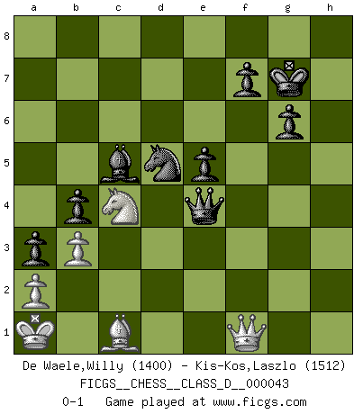 Last move : 0-1 2007 May 16 21:0:11 [Event "FICGS__CHESS__CLASS_D__000043"] [Site "FICGS"] [Date "2007.05.01"] [Round "1"] [White "De Waele,Willy"] [Black "Kis-Kos,Laszlo"] [Result "0-1"] [WhiteElo "1400"] [BlackElo "1512"] 1.e4 c5 2.Nf3 d6 3.d4 cxd4 4.Nxd4 Nf6 5.Nc3 a6 6.Be3 e5 7.Nb3 Be6 8.f3 Be7 9.Qd2 Nbd7 10.g4 h6 11.O-O-O b5 12.Kb1 Nb6 13.Qf2 Rb8 14.h4 Qc7 15.g5 hxg5 16.hxg5 Rxh1 17.gxf6 Rxf1 18.Qxf1 Bxf6 19.Qd3 Nc4 20.Bc1 a5 21.Rh1 g6 22.Nd2 Qc5 23.Nb3 Qb6 24.Nd5 Bxd5 25.Qxd5 a4 26.Nd2 Ne3 27.Qd3 Rc8 28.c3 Ng2 29.Nf1 a3 30.b3 Nf4 31.Qd2 Qc5 32.Ne3 Qxc3 33.Qxd6 b4 34.Rd1 Be7 35.Qa6 Kf8 36.Nc4 Rc5 37.Qb7 Qxf3 38.Qd7 Qxe4+ 39.Ka1 Rd5 40.Rxd5 Nxd5 41.Qh3 Kg7 42.Qf1 Bc5 0-1 Sicilian : Najdorf, Byrne (English) attack Queenside Castling by player White (move 11) Player Black won this chess game. Follow this game move after move (download)I guess a certain amount of temperament is expected of Chess geniuses. (Ron Gross) Wenn ich gewinne bin ich ein Genie. Wenn nicht, dann bin ich keines. (Robert James Fischer) Siempre es mucho mejor sacrificar las piezas de tu oponente. (Savielly Tartakover) On croit qu'il y a plus de mauvais joueurs que de bons joueurs, c'est faux : Il y a autant de joueurs qui gagnent que de joueurs qui perdent. (Philippe Geluck) A mistake is only a mistake if you let it happen twice. Otherwise it is a learning experience. (Daniel Parmet)