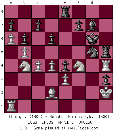 Last move : 1-0 2018 April 5 22:12:23 [Event "FICGS__CHESS__RAPID_C__000160"] [Site "FICGS"] [Date "2018.03.30"] [Round "1"] [White "Tilmu,Timo"] [Black "Sanchez Palencia,Gonzalo"] [Result "1-0"] [WhiteElo "1800"] [BlackElo "1500"] 1.d4 Nf6 2.Nf3 g6 3.e3 Bg7 4.Be2 d6 5.O-O O-O 6.c4 Nbd7 7.Nc3 e5 8.b4 Re8 9.a4 e4 10.Ne1 Nf8 11.b5 h5 12.Nc2 h4 13.h3 N8h7 14.Nb4 Bd7 15.f4 Bf5 16.a5 Qd7 17.a6 b6 18.Qe1 Bxh3 19.gxh3 Qxh3 20.Qf2 g5 21.fxg5 Nxg5 22.Qg2 Qxg2+ 23.Kxg2 Kh7 24.Rf4 h3+ 25.Kh2 Kg6 26.Bd2 Nh5 27.Rh4 Rh8 28.Ncd5 Rae8 29.Bxh5+ Rxh5 30.Nf4+ 1-0 King's Indian : East Indian defense Kingside Castling by player White (move 5) Kingside Castling by player Black (move 5) Player White won this chess game. Follow this game move after move (download)Chess is a sea in which a gnat may drink and an elephant may bathe. (Hindu proverb) Sicherlich können nur Meister einen Stil haben. Daß ein nicht-Meister auch nur ein einziges Mal in seinem Leben eine Partie folgerecht durchführte, habe ich niemals bemerkt. (Emanuel Lasker) Los problemas de Ajedrez exigen del compositor las mismas virtudes que caracterizan todo el arte de valor: originalidad, invención, concisión, armonía, complejidad e insinceridad explendida. (Vladimir Nabokov) Il n'y a plus de joueurs du niveau de Jacob Murray dont la seule quête est le beau jeu, le plaisir de voir les pièces construire quelque chose. Sur 10 idées à la minute, 9 seront sans intérêt, la dernière s'avèrera géniale. (Christian Bauer) I'll be back. (Arnold Schwarzenegger)