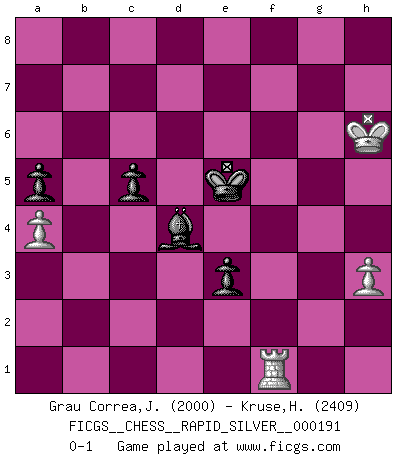 Last move : 0-1 2018 May 6 22:59:12 [Event "FICGS__CHESS__RAPID_SILVER__000191"] [Site "FICGS"] [Date "2018.03.30"] [Round "1"] [White "Grau Correa,Jose Horacio"] [Black "Kruse,Herbert"] [Result "0-1"] [WhiteElo "2000"] [BlackElo "2409"] 1.e4 e5 2.Nf3 Nc6 3.Bb5 Nf6 4.O-O Nxe4 5.d4 Nd6 6.Bxc6 dxc6 7.dxe5 Nf5 8.Qxd8+ Kxd8 9.Rd1+ Ke8 10.Nc3 Be7 11.Ne2 b6 12.Nfd4 Nxd4 13.Nxd4 Bd7 14.a4 h5 15.Be3 Rd8 16.Rd2 g5 17.c3 a5 18.Rad1 Rg8 19.f3 Rg6 20.c4 Bb4 21.Rd3 Be7 22.h3 h4 23.Kf2 Bc8 24.b3 c5 25.Nb5 Rxd3 26.Rxd3 Bd8 27.Rd1 Bf5 28.Rd2 Re6 29.Bxg5 Bxg5 30.Nxc7+ Kf8 31.Nxe6+ fxe6 32.Rd6 Bf4 33.Rxb6 Bxe5 34.Ke3 Bc3 35.Kf4 Ke7 36.Kg5 Be1 37.Rb7+ Kd6 38.Rb6+ Ke5 39.Rc6 Kd4 40.f4 Bf2 41.Rd6+ Ke3 42.Ra6 Be1 43.Rc6 Bb4 44.Kxh4 Kxf4 45.g3+ Ke5 46.g4 Bc2 47.Kh5 Bxb3 48.g5 Bxc4 49.g6 Kf6 50.Rd6 Bc3 51.Kh6 Ke7 52.Rc6 Bd4 53.g7 e5 54.Rc8 e4 55.g8Q Bxg8 56.Rxg8 e3 57.Rg1 Kf6 58.Rf1+ Ke5 0-1 Ruy Lopez : Berlin defense, Open variation Kingside Castling by player White (move 4) Promotion Queen by player White (move 55) 10 pieces endgame at move 55 : White KRPP , Black KBBPPP WHITE : King + 1 Rook 2 Pawns BLACK : King + 2 Bishops 3 Pawns 9 pieces endgame at move 56 : White KRPP , Black KBPPP WHITE : King + 1 Rook 2 Pawns BLACK : King + 1 Bishop 3 Pawns Player Black won this chess game. Follow this game move after move (download)Man is a frivolous, a specious creature, and like a Chess player, cares more for the process of attaining his goal than for the goal itself. (Dostoyevsky) Wenn Dein Gegner dir ein Remis anbietet, versuch herauszufinden, weshalb er glaubt schlechter zu stehen. (Nigel Short) El Ajedrez es un regaderazo frÃo para la mente. (Sir John Simon) Il vaut mieux sacrifier les pièces de l'adversaire. (Xavier Tartacover) Empty your mind, be formless, shapeless — like water. (Bruce Lee)
