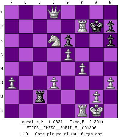 Last move : 1-0 2018 June 3 12:52:57 [Event "FICGS__CHESS__RAPID_E__000206"] [Site "FICGS"] [Date "2018.03.30"] [Round "1"] [White "Leurette,Marc-Antoine"] [Black "Tkac,Patrik"] [Result "1-0"] [WhiteElo "1082"] [BlackElo "1200"] 1.e4 Nc6 2.Nf3 Nf6 3.Nc3 e5 4.Bc4 Bc5 5.O-O O-O 6.d3 d6 7.a3 Be6 8.Bxe6 fxe6 9.b4 Ng4 10.bxc5 Qf6 11.cxd6 cxd6 12.h3 Nh6 13.Bg5 Qf7 14.Bxh6 gxh6 15.Qe2 Nd4 16.Nxd4 exd4 17.Nb5 a6 18.Nxd6 Qd7 19.e5 a5 20.f4 Qg7 21.Qf2 Ra6 22.Qxd4 Qg6 23.Nxb7 Ra7 24.Qxa7 Rf7 25.Qa8+ Rf8 26.Qxa5 Rb8 27.Nd6 Rb2 28.Rab1 Rxc2 29.Qd8+ Kg7 30.Rb7+ Qf7 31.Rxf7+ 1-0 This chess game has been lost on time (started : 2018.03.30 19:6:20) KP : Nimzovich defense Kingside Castling by player White (move 5) Kingside Castling by player Black (move 5) Player White won this chess game. Follow this game move after move (download)Fischer Chess play was always razor-sharp, rational and brilliant. One of the best ever. (Dave Regis) Wenn du gegen Bobby spielst, ist es keine Frage von gewinnen oder verlieren. Es ist eine Frage des Überlebens. (Boris Vassilievich Spassky) Los libros de Ajedrez deben de usarse igual como usamos los anteojos: para mejorar la vista, aunque algunos jugadores los quieren usar como si ellos les otorgaran la vision. (José Raúl Capablanca) L'attaque fait le spectacle, la défense gagne les matchs. (Dicton footballistique) Nobody is always a winner, and anybody who says he is, is either a liar or doesn't play poker. (Amarillo Slim)