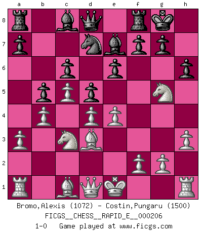 Last move : 1-0 2018 May 12 23:14:11 [Event "FICGS__CHESS__RAPID_E__000206"] [Site "FICGS"] [Date "2018.03.30"] [Round "1"] [White "Bromo,Alexis"] [Black "Costin,Pungaru"] [Result "1-0"] [WhiteElo "1072"] [BlackElo "1500"] 1.d4 Nf6 2.c4 e6 3.a3 d5 4.e3 Nbd7 5.Nc3 c6 6.Nf3 Be7 7.h3 O-O 8.c5 b5 9.b4 h6 10.Bd3 Nh7 11.e4 Ng5 12.Nxg5 1-0 This chess game has been lost on time (started : 2018.03.30 19:6:20) Queen's pawn game Kingside Castling by player Black (move 7) Player White won this chess game. Follow this game move after move (download)Weak points or holes in the opponent's position must be occupied by pieces not Pawns. (Siegbert Tarrasch) Jeder weiß, dass Gasprom Putins persönliches Machtinstrument ist. Die Firma wird vom Kreml aus geleitet und wird schon deshalb nie transparent sein. (Garry Kasparov) Las Aperturas te enseñan aperturas. ¡Los Finales te enseñan Ajedrez!. (Stephan Gerzadowicz) Ne tendez aucun piège pour le plaisir ! Ne jouez rien dans l'espoir que l'adversaire réagisse de façon stupide ! Prenez toujours pour acquis que l'adversaire va trouver le meilleur coup ! Ne jouez jamais de coup dans l'espoir que l'adversaire ne voie pas la menace ! Chacun de vos coups doit améliorer la position d'une façon ou d'une autre. The beginning is the most important part of the work. (Plato)