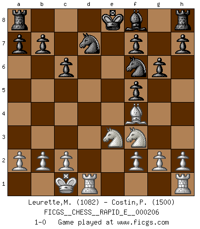 Last move : 1-0 2018 May 12 11:13:51 [Event "FICGS__CHESS__RAPID_E__000206"] [Site "FICGS"] [Date "2018.03.30"] [Round "1"] [White "Leurette,Marc-Antoine"] [Black "Costin,Pungaru"] [Result "1-0"] [WhiteElo "1082"] [BlackElo "1500"] 1.e4 c6 2.d4 d5 3.Nc3 dxe4 4.Nxe4 Bf5 5.Nc3 e6 6.Bd3 Qxd4 7.Bxf5 Qxd1+ 8.Nxd1 exf5 9.Nf3 Nd7 10.Bf4 Ngf6 11.Ne3 g6 12.O-O-O 1-0 This chess game has been lost on time (started : 2018.03.30 19:6:20) Caro-Kann : Classical variation Queenside Castling by player White (move 12) Player White won this chess game. Follow this game move after move (download)In Chess, at least, the brave inherit the earth. (Edmar Mednis) Woher wissen wir, daß der Neanderthaler Blindschach gespielt hat? -- Bei Ausgrabungen wurden keine Schachbretter und Figuren gefunden. (Anonymous) Botvinnik trataba de restarle el misterio al Ajedrez, siempre relacionandolo a situaciones de la vida ordinaria. El gustaba de llamar al Ajedrez un típico problema inexacto similar a aquellos de los cuales la gente siempre tiene que enfrentarse en la vida cotidiana. (Garry Kasparov) Ce qui caractérise les parties de combat, c'est que si le défenseur a constamment de difficiles problèmes à résoudre, l'attaquant doit chercher sans relâche de nouvelles possibilités d'attaque. (Koblentz) Perception is reality. (Immanuel Kant)