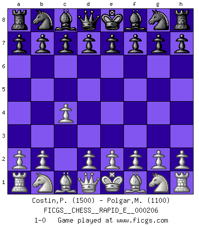 Last move : 1-0 2018 April 30 10:3:47 [Event "FICGS__CHESS__RAPID_E__000206"] [Site "FICGS"] [Date "2018.03.30"] [Round "1"] [White "Costin,Pungaru"] [Black "Polgar,Mahathiswari"] [Result "1-0"] [WhiteElo "1500"] [BlackElo "1100"] 1.c4 1-0 This chess game has been lost on time (started : 2018.03.30 19:6:20) English Opening Player White won this chess game. Follow this game move after move (download)As one by one I mowed them down, my superiority soon became apparent. (Jose Capablanca) Wenn ein Kopf und ein Buch zusammenstoßen und es klingt hohl, ist es denn allemal im Buche? (Georg Christoph Lichtenberg) El Ajedrez es el arte del análisis. (Mikhail Botvinnik) Toutes choses étant égales, c'est la conviction qui gagne. Alliée à une volonté de vaincre, elle sert de détonateur, suscite des idées, disperse les doutes et aide à penser clairement. (Robert Fischer) Looking at the proliferation of personal web pages on the Net, it looks like very soon everyone on Earth will have 15 megabytes of fame. (M.G. Sriram)