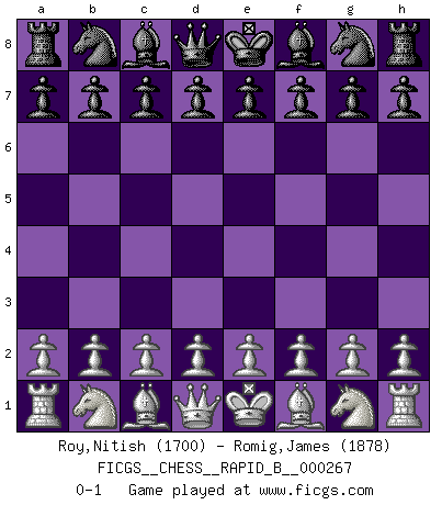Last move : 0-1 2018 April 29 22:3:1 [Event "FICGS__CHESS__RAPID_B__000267"] [Site "FICGS"] [Date "2018.03.30"] [Round "1"] [White "Roy,Nitish"] [Black "Romig,James"] [Result "0-1"] [WhiteElo "1700"] [BlackElo "1878"] 0-1 This chess game has been lost on time (started : 2018.03.30 20:10:36) Player Black won this chess game. Follow this game move after move (download)You are for me the Queen on d8 and I am the Pawn on d7 !! (Eduard Gufeld) Die Partien sind immer verschieden, die Interviews immer die gleichen. (Garry Kasparov) Solo el jugador con la iniciativa tiene el derecho a atacar. (Wilhelm Steinitz) Nous vivons dans un monde échiquéen : chaque jour qui passe est un défi à relever. (Philosophe Sasha) All art requires courage. (Anne Tucker)