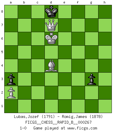 Last move : 1-0 2018 April 8 18:38:44 [Event "FICGS__CHESS__RAPID_B__000267"] [Site "FICGS"] [Date "2018.03.30"] [Round "1"] [White "Lubas,Jozef"] [Black "Romig,James"] [Result "1-0"] [WhiteElo "1791"] [BlackElo "1878"] 1.e4 Nf6 2.e5 Nd5 3.d4 d6 4.c4 Nb6 5.f4 Bf5 6.Nc3 e6 7.Nf3 dxe5 8.fxe5 Bb4 9.Bd3 c5 10.Bg5 Qd7 11.Bxf5 exf5 12.d5 h6 13.Bc1 Nxc4 14.O-O Bxc3 15.bxc3 Na6 16.Qd3 Nb6 17.c4 O-O-O 18.Bd2 Rhe8 19.Rab1 Nc7 20.h4 Nxc4 21.Qxc4 Qxd5 22.Qc2 Ne6 23.Qxf5 Rd7 24.Qc2 b6 25.Rfe1 Qd3 26.Qa4 Red8 27.Be3 Kb7 28.Nd2 Qa6 29.Qxa6+ Kxa6 30.Ne4 Rd5 31.Nd6 f6 32.Rb3 b5 33.Rc1 fxe5 34.Nxb5 Rd3 35.Rcb1 Rxb3 36.Rxb3 Rd7 37.Na3 Rb7 38.Rxb7 Kxb7 39.Nc4 e4 40.Nd6+ Kc6 41.Nxe4 Kd5 42.Ng3 Kc4 43.Kf2 Kd3 44.h5 a6 45.Kf3 a5 46.Ne2 Kc4 47.Ke4 a4 48.Bc1 Nc7 49.Bb2 Ne8 50.Be5 Kb4 51.g4 a3 52.Nc3 Ka5 53.Nd5 Ka4 54.Nc7 Nxc7 55.Bxc7 Kb5 56.Kd5 c4 57.Be5 Ka5 58.Kxc4 Kb6 59.Kd5 Kb7 60.Bxg7 Kc7 61.Bd4 Kd7 62.g5 hxg5 63.h6 Ke7 64.h7 g4 65.h8Q Kd7 66.Qg7+ Kd8 67.Kd6 g3 68.Qd7+ 1-0 Alekhine's defense : Four pawns attack, Trifunovic variation Kingside Castling by player White (move 14) Queenside Castling by player Black (move 17) 10 pieces endgame at move 55 : White KBPPP , Black KPPPP WHITE : King + 1 Bishop 3 Pawns BLACK : King + 4 Pawns 9 pieces endgame at move 58 : White KBPPP , Black KPPP WHITE : King + 1 Bishop 3 Pawns BLACK : King + 3 Pawns 8 pieces endgame at move 60 : White KBPPP , Black KPP WHITE : King + 1 Bishop 3 Pawns BLACK : King + 2 Pawns 7 pieces endgame at move 62 : White KBPP , Black KPP WHITE : King + 1 Bishop 2 Pawns BLACK : King + 2 Pawns Promotion Queen by player White (move 65) Player White won this chess game. Follow this game move after move (download)I played Chess with him and would have beaten him sometimes only he always took back his last move, and ran the game out differently. (Mark Twain) Gewöhnliche Menschen denken nur daran, wie sie ihre Zeit verbringen. Ein intelligenter Mensch versucht, sie auszunutzen. (Arthur Schopenhauer) En el Ajedrez, tal como es jugado por los Maestros, practicamente la suerte es eliminada. (Emanuel Lasker) Votre seul travail dans les ouvertures est d'obtenir un milieu de partie jouable. (Lajos Portish) There are three kinds of lies: lies, damned lies and statistics. (Mark Twain)