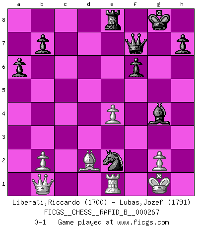 Last move : 0-1 2018 May 30 17:18:35 [Event "FICGS__CHESS__RAPID_B__000267"] [Site "FICGS"] [Date "2018.03.30"] [Round "1"] [White "Liberati,Riccardo"] [Black "Lubas,Jozef"] [Result "0-1"] [WhiteElo "1700"] [BlackElo "1791"] 1.e4 e5 2.Nf3 Nc6 3.Bb5 a6 4.Ba4 Nf6 5.O-O Be7 6.Bxc6 dxc6 7.Qe2 Bd6 8.d3 O-O 9.h3 Re8 10.Be3 Nh5 11.Nbd2 Bd7 12.Ng5 g6 13.Ngf3 c5 14.Rfe1 f6 15.c3 Qe7 16.Nc4 Qf7 17.Nxd6 cxd6 18.Nd2 Rad8 19.Nc4 Be6 20.d4 Bxc4 21.Qg4 cxd4 22.cxd4 Bxa2 23.Rad1 Bb3 24.Rd3 Be6 25.Qd1 Nf4 26.Rd2 g5 27.Qb1 d5 28.f3 dxe4 29.fxe4 exd4 30.Bxd4 g4 31.hxg4 Bxg4 32.Be3 Rxd2 33.Bxd2 Ne2+ 0-1 Ruy Lopez : Exchange variation doubly deferred (DERLD) Kingside Castling by player White (move 5) Kingside Castling by player Black (move 8) Player Black won this chess game. Follow this game move after move (download)There is no remorse like the remorse of Chess. (H. G. Wells) Das Schachspiel ist ein See, in welchem eine Mücke baden und ein Elefant ertrinken kann. (Emanuel Lasker) Observen a Garry Kasparov. Después de una derrota, invariablemente el gana la próxima partida. Prácticamente hace pedazos a su siguiente oponente. Eso es algo que tenemos que aprender a lograr. (Maurice Ashley) Les échecs sont un jeu par leur forme, un art par leur essence et une science par sa difficulté d'acquisition. Ils peuvent vous procurer autant de plaisir qu'un bon livre ou une belle musique, mais vous n'aurez une réelle joie que si vous arrivez à bien jouer. (Tigran Petrosian) Wikichess, chess moves explained by 'experimented' players. (Thibault de Vassal)