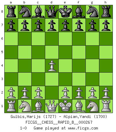 Last move : 1-0 2018 April 29 22:3:1 [Event "FICGS__CHESS__RAPID_B__000267"] [Site "FICGS"] [Date "2018.03.30"] [Round "1"] [White "Gulbis,Harijs"] [Black "Alpian,Yandi"] [Result "1-0"] [WhiteElo "1727"] [BlackElo "1700"] 1.d4 1-0 This chess game has been lost on time (started : 2018.03.30 20:10:36) Queen's pawn Player White won this chess game. Follow this game move after move (download)Let the perfectionist play postal. (Yasser Seirawan) Weshalb minderdergeübte Spieler mit g2-g4 beginnen? Die betreffenden sind unschlüssig, ob sie nun rechts (h4) oder links (f4) beginnen sollen, und in ihrer Ratlosigkeit entschliessen sie sich nach guter Bürgerart dazu, den goldenen Mittelweg zu wählen. (Aaron Nimzowitsch) Desconfianza es la característica mas necesaria de un jugador de Ajedrez. (Siegbert Tarrasch) La menace est plus forte que l'exécution. (Aaron Nimzovitch) Imagination is more important than knowledge. Knowledge is limited. Imagination encircles the world. (Albert Einstein)