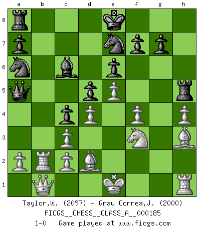 Last move : 1-0 2018 July 30 20:50:26 [Event "FICGS__CHESS__CLASS_A__000185"] [Site "FICGS"] [Date "2018.03.31"] [Round "1"] [White "Taylor,William"] [Black "Grau Correa,Jose Horacio"] [Result "1-0"] [WhiteElo "2097"] [BlackElo "2000"] 1.e4 c6 2.d4 d5 3.e5 Bf5 4.h4 h6 5.g4 Bd7 6.Nc3 e6 7.Be3 Bb4 8.f4 Bxc3+ 9.bxc3 Ne7 10.Rb1 h5 11.Rxb7 Qa5 12.Qb1 Na6 13.gxh5 c5 14.Bd2 c4 15.Bh3 Bc6 16.Rb2 Rxh5 17.Nf3 1-0 Caro-Kann : Advance variation Player White won this chess game. Follow this game move after move (download)The isolated Pawn casts gloom over the entire chessboard. (Aaron Nimzovich) Spielt Blackmar-Diemer-Gambit, und das Matt kommt von selbst! (Emil Joseph Diemer) Me gusta decir que Bobby Fischer fue el mejor jugador que jamás haya existido. Pero lo que hizo de Fischer un genio, fue su habilidad de mezclar una frescura y pragmatismo Americano con ideas Rusas acerca de la estrategia. (Bruce Pandolfini) Les écrivains ont utilisé les échecs pour analyser les côtés extrêmes de la nature humaine. Dans ce cadre, les échecs offrent un champ d'expérimentation idéal. Mais on pourrait faire la même chose avec la peinture. Et là, en vous référant à Van Gogh, vous ne tirerez pas de conclusion définitive sur les peintres. (Gary Kasparov) Every now and then a man's mind is stretched by a new idea and never shrinks back to its former dimensions. (Oliver Wendell Holmes, Sr.)