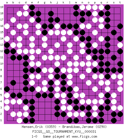 Last move : 1-0 2007 November 9 17:32:1 [Event "FICGS__GO__TOURNAMENT_KYU__000031"] [Site "FICGS"] [Date "2007.05.02"] [Round "1"] [Black "Hensen,Erik"] [White "Brandibas,Jerome"] [Result "1-0"] [Rating 1 "0359"] [Rating 2 "0290"] 1.r16 d16 2.q3 q5 3.r5 r6 4.r4 p4 5.e4 c4 6.c3 d3 7.d4 c2 8.b3 b4 9.e3 d2 10.c5 b2 11.b5 a3 12.d10 d12 13.c17 c16 14.b16 b15 15.d14 e14 16.d13 e12 17.e15 b17 18.f17 d15 19.d17 e13 20.e16 a16 21.k16 c13 22.j4 s5 23.q6 s4 24.o2 q4 25.r3 p6 26.s6 q7 27.s7 s3 28.r8 r7 29.q12 q8 30.r9 p3 31.q2 p2 32.p1 r2 33.n17 f15 34.g15 f16 35.q1 t6 36.o3 s8 37.s9 t7 38.g12 e17 39.g16 d18 40.e18 c18 41.f18 g14 42.m13 h15 43.h16 j15 44.j9 j16 45.j17 r1 46.o1 o4 47.n3 k15 48.l16 j13 49.f11 e11 50.m4 f10 51.e9 g11 52.e2 h12 53.g8 n5 54.c11 g9 55.l6 f8 56.q10 e8 57.f9 f12 58.d8 e10 59.d9 g7 60.o10 h8 61.h10 j11 62.k10 l13 63.g10 h9 64.j8 j10 65.h7 h11 66.n14 j7 67.h6 k9 68.k8 l9 69.k7 l10 70.b12 b13 71.e6 g6 72.g5 m5 73.m12 l12 74.s2 j6 75.h5 k5 76.l5 l8 77.l14 k14 78.h18 m11 79.n11 n10 80.n9 m10 81.o8 l15 82.k6 m14 83.m16 n12 84.o12 n13 85.o13 o11 86.n15 p10 87.p11 o9 88.p9 o10 89.q9 n8 90.r17 p8 91.d1 c1 92.e1 a5 93.a6 a4 94.b7 f6 95.f5 e7 96.d7 n4 97.l4 m6 98.t9 t8 99.a13 a14 100.t2 t3 101.a12 c12 102.b11 l7 103.e19 d19 104.d11 p13 105.p12 q14 106.r14 p15 107.m15 o16 108.r13 q16 109.h17 m2 110.m3 l2 111.j2 k3 112.j3 k4 113.d6 p17 114.q18 p18 115.n18 q19 116.r19 p19 117.o14 n19 118.m19 o19 119.o18 q17 120.r18 r11 121.q11 s12 122.r12 n16 123.m18 s13 124.s11 t11 125.r10 s14 126.s15 t15 127.t16 t14 128.t12 t13 129.t12 t13 130.t10 o7 131.t14 c14 132.pass g13 133.pass j5 134.k2 l3 135.l1 n2 136.s1 m9 137.m1 k11 138.pass 1-0 Here are the names of the openings (joseki) played in the four corners : Corner q4 : q3 q5 Komoku (Somok, Xiao~mu`) 3-4 Point. The komoku (3-4) point is the traditional corner enclosure move.. Ikken Takagakari (Hankan Nop'dakeolch'im, Yi Gaogua`jiao~, 1-Space High Approach). The 5-4 approach move has become more popular in modern times, as modern Go emphasizes speed and influence. Corner d4 : e4 c4 Takamoku (Gomok, Gaomu`) 5-4 Point. The takamoku (high) point (5-4). With its emphasis on influence, the 5-4 point complements the 4-4 (hoshi) point in creating an influence-oriented fuseki. Komoku. Black responds with 3-3, 3-5, 4-6, 4-7, 3-6, 3-7. Player Black won this Go (weiqi, baduk) game. Follow this game move after move (download)Josekis are not fixed, definitive things. They indicate the moments when everything can change. (Pierre Audouard) Perfection is achieved, not when there is nothing more to add, but when there is nothing left to take away. (Antoine de Saint-Exupéry)