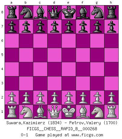 Last move : 0-1 2018 April 30 22:4:33 [Event "FICGS__CHESS__RAPID_B__000268"] [Site "FICGS"] [Date "2018.03.31"] [Round "1"] [White "Suwara,Kazimierz"] [Black "Petrov,Valery"] [Result "0-1"] [WhiteElo "1834"] [BlackElo "1700"] 0-1 This chess game has been lost on time (started : 2018.03.31 20:2:19) Player Black won this chess game. Follow this game move after move (download)The tactician must know what to do whenever something needs doing; the strategist must know what to do when nothing needs doing. (Savielly Tartakover) Schach ist Leben. (Robert James Fischer) Aquel que teme a un Peón de Reina aislado, debería de retirarse del Ajedrez. (Siegbert Tarrasch) On peut tirer plus d'utilité d'une partie perdue que de 100 parties gagnées. (Capablanca) A computer lets you make more mistakes faster than any invention in human history - with the possible exceptions of handguns and tequila. (Mitch Ratcliffe)