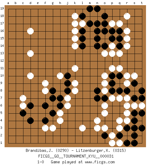 Last move : 1-0 2007 August 2 13:52:42 [Event "FICGS__GO__TOURNAMENT_KYU__000031"] [Site "FICGS"] [Date "2007.05.02"] [Round "1"] [Black "Brandibas,Jerome"] [White "Litzenburger,Xavier"] [Result "1-0"] [Rating 1 "0290"] [Rating 2 "0315"] 1.d4 d16 2.p16 q3 3.p4 q4 4.q5 r5 5.p6 l3 6.p3 r6 7.q2 r2 8.r3 r4 9.s3 p2 10.s2 q1 11.s4 g3 12.f4 r16 13.q15 r15 14.r8 q7 15.q8 p7 16.o2 o3 17.o4 n3 18.o7 o8 19.n7 o10 20.q6 o6 21.p5 n4 22.n8 o9 23.p8 r7 24.s7 s6 25.t8 r10 26.s9 s10 27.s5 t6 28.t5 d10 29.t7 o5 30.s1 p17 31.q10 q11 32.p10 p11 33.p9 r9 34.r1 c6 35.q2 p1 36.t3 k17 37.n16 k11 38.o17 q17 39.q16 k14 40.d6 c7 41.c5 d13 42.l16 k16 43.l15 k15 44.l14 m18 45.m17 n18 46.o18 r18 47.n19 l17 48.n17 o15 49.o14 p14 50.q14 o13 51.n14 p13 52.p15 f8 53.f6 f3 54.l18 k18 55.m19 r14 56.n15 q13 57.o16 h5 58.g7 j7 59.g8 f9 60.g5 h4 61.h6 j6 62.h7 h10 63.j8 k8 64.j9 k9 65.j10 1-0 Here are the names of the openings (joseki) played in the four corners : Corner q4 : q3 p4 Komoku (Somok, Xiao~mu`) 3-4 Point. The komoku (3-4) point is the traditional corner enclosure move.. Corner d4 : d4 g3 Hoshi (Hwajeom, Seongjeom, Xingwei`) 4-4 Point. The star or hoshi (4-4) point, emphasizing influence at the potential expense of territory. Nikken Kakari (Dukan Keolch'im, E`r Gua`jiao~, 2-Space Low Approach). Black typically answers by 7-3 or 3-5 (which is not joseki). Corner q16 : p16 r16 Takamoku (Gomok, Gaomu`) 5-4 Point. The takamoku (high) point (5-4). With its emphasis on influence, the 5-4 point complements the 4-4 (hoshi) point in creating an influence-oriented fuseki. Komoku. Black responds with 3-3, 3-5, 4-6, 4-7, 3-6, 3-7. Player Black won this Go (weiqi, baduk) game. Follow this game move after move (download)Don't make compact groups of stones. (Anonymous) The quality of decision is like the well-timed swoop of a falcon which enables it to strike and destroy its victim. (Sun Tzu)
