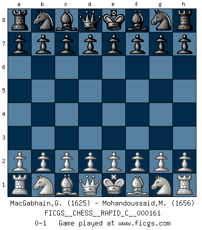Last move : 0-1 2018 May 1 22:17:18 [Event "FICGS__CHESS__RAPID_C__000161"] [Site "FICGS"] [Date "2018.04.01"] [Round "1"] [White "MacGabhain,Gearoid"] [Black "Mohandoussaid,Malik"] [Result "0-1"] [WhiteElo "1625"] [BlackElo "1656"] 0-1 This chess game has been lost on time (started : 2018.04.01 20:20:44) Player Black won this chess game. Follow this game move after move (download)The laws of Chess do not permit a free choice: you have to move whether you like it or not. (Emanuel Lasker) Die Auseinandersetzung mit Karpow war politisch geprägt. Er stand für das kommunistische System, wurde von dessen Repräsentanten gehätschelt. Ich war der Oppositionelle. Jeder Schachweltmeister spiegelt auch die gesellschaftlichen Verhältnisse wider. Kramnik steht für die Börsen-Generation des Neuen Markts, ideologiefrei, zahlenfixiert. (Garry Kasparov) No puedes jugar al Ajedrez si eres de corazón noble. (Proverbio Francés) Soyez une menace à chaque fois que vous vous asseyez pour jouer. (Ken Smith) Your best chance to get a Royal Flush in a casino is in the bathroom. (Anonymous)