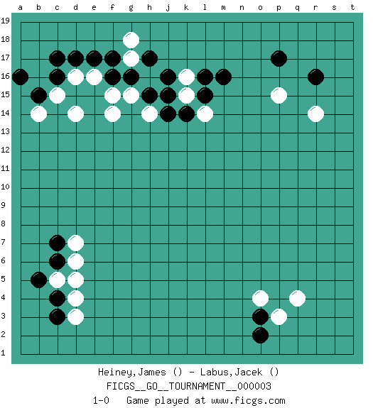 Last move : 1-0 2006 August 21 6:27:16 [Event "FICGS__GO__TOURNAMENT__000003 "] [Site "FICGS"] [Date "2006.06.03"] [Round "1"] [Black "Heiney,James "] [White "Labus,Jacek "] [Result "1-0"] 1.r16 d16 2.c17 d4 3.d17 q4 4.o3 o4 5.c6 d6 6.c4 c5 7.b5 d5 8.c3 d3 9.c7 r14 10.p17 p15 11.m16 k16 12.f16 d14 13.b15 p3 14.o2 d7 15.k14 f14 16.h15 c15 17.c16 b14 18.a16 e16 19.e17 f15 20.g16 g15 21.j15 h16 22.h17 g17 23.f17 g18 24.j16 h14 25.j14 k15 26.l15 l14 27.l16 1-0 This go game has been lost on time (started : 2006.06.03 13:0:3) Here are the names of the openings (joseki) played in the four corners : Corner d16 : d16 c17Hoshi (Hwajeom, Seongjeom, Xingwei`) 4-4 Point. The star or hoshi (4-4) point, emphasizing influence at the potential expense of territory. Corner q4 : q4 o3Hoshi (Hwajeom, Seongjeom, Xingwei`) 4-4 Point. The star or hoshi (4-4) point, emphasizing influence at the potential expense of territory.Ikken Kakari (Hankan Keolch'im, Yi Gua`jiao~, 1-Space Low Approach). Black 2 is the standard approach move to the 4-4. Corner d4 : d4 c6Hoshi (Hwajeom, Seongjeom, Xingwei`) 4-4 Point. The star or hoshi (4-4) point, emphasizing influence at the potential expense of territory.Ikken Kakari (Hankan Keolch'im, Yi Gua`jiao~, 1-Space Low Approach). Black 2 is the standard approach move to the 4-4. Corner q16 : r16 r14Komoku (Somok, Xiao~mu`) 3-4 Point. The komoku (3-4) point is the traditional corner enclosure move.. Player Black won this Go (weiqi, baduk) game.Follow this game move after move (download ) You have to like to win, and to learn to recognize the errors that gave you the victory. (Pierre Audouard) You think that education is too expensive ? Try ignorance. (Derek Bok)
