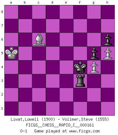 Last move : 0-1 2018 April 16 1:36:58 [Event "FICGS__CHESS__RAPID_C__000161"] [Site "FICGS"] [Date "2018.04.01"] [Round "1"] [White "Liwat,Lowell"] [Black "Vollmer,Steve"] [Result "0-1"] [WhiteElo "1900"] [BlackElo "1555"] 1.d4 d5 2.c4 e6 3.e3 Nf6 4.a3 a5 5.Nc3 c5 6.cxd5 exd5 7.dxc5 Bxc5 8.Nf3 O-O 9.Bd3 Nc6 10.Ng5 h6 11.h4 d4 12.Na4 Bd6 13.Qc2 dxe3 14.Bxe3 Ne5 15.Bh7+ Kh8 16.Rd1 Qe7 17.Nb6 Rb8 18.Nd5 Nxd5 19.Rxd5 Be6 20.Rxd6 Qxd6 21.Bc5 Qc6 22.Bxf8 Qxc2 23.Bxc2 Rxf8 24.Nxe6 fxe6 25.Ke2 Nc6 26.Rd1 e5 27.Bg6 Nd4+ 28.Ke1 Rd8 29.f3 Kg8 30.Be4 b6 31.Kf2 Kf7 32.g4 Kf6 33.Rc1 Rd7 34.Rc8 g5 35.h5 Rd6 36.Ke3 Ke7 37.Rh8 Rf6 38.Rb8 Kd7 39.Rb7+ Kd8 40.a4 Ke8 41.Bd5 Kd8 42.Rb8+ Kc7 43.Re8 Kd6 44.Be4 Re6 45.Rd8+ Ke7 46.Rd5 Kf6 47.Rxd4 exd4+ 48.Kxd4 Rd6+ 49.Bd5 Rd7 50.Kc4 Ke5 51.Be4 Rd4+ 52.Kc3 Rxa4 53.Bc6 Rb4 54.b3 Kd6 55.Be4 Ke5 56.Bc6 Rd4 57.Be8 Rd1 58.Kc4 Rd2 59.Bc6 Kf4 60.Kb5 Rd3 61.Kxb6 Rxb3+ 62.Kxa5 Rxf3 0-1 Queen's gambit declined Kingside Castling by player Black (move 8) 10 pieces endgame at move 61 : White KBPPP , Black KRPPP WHITE : King + 1 Bishop 3 Pawns BLACK : King + 1 Rook 3 Pawns 9 pieces endgame at move 62 : White KBPPP , Black KRPP WHITE : King + 1 Bishop 3 Pawns BLACK : King + 1 Rook 2 Pawns 8 pieces endgame at move 62 : White KBPP , Black KRPP WHITE : King + 1 Bishop 2 Pawns BLACK : King + 1 Rook 2 Pawns Player Black won this chess game. Follow this game move after move (download)Chess problems demand from the composer the same virtues that characterize all worthwhile art: originality, invention, conciseness, harmony, complexity, and splendid insincerity. (Vladimir Nabokov) Im Internet Chess Club betrug mein Rating vorübergehend 3350 ELO-Punkte. (Sergej Karjakin) El Ajedrez es una manera fabulosa para que los niños aprendan a autovalorarse y a autoestimarse. (Saudin Robovic) Même un GMI sait rarement calculer sur plus de cinq coups une attaque à sacrifices. (Rudolf Spielmann) Patience, use the Force, think ! (Obi-Wan Kenobi in Star Wars ep.2)