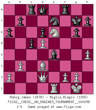 Last move : 1-0 2018 May 28 19:31:33 [Event "FICGS__CHESS__NO_ENGINES_TOURNAMENT__000098"] [Site "FICGS"] [Date "2018.04.03"] [Round "1"] [White "Romig,James"] [Black "Niglio,Biagio"] [Result "1-0"] [WhiteElo "1878"] [BlackElo "1305"] 1.c4 c5 2.Nf3 Nc6 3.Nc3 g6 4.e3 Bg7 5.d4 d6 6.d5 Ne5 7.Nxe5 Bxe5 8.Bd3 e6 9.O-O Ne7 10.e4 exd5 11.cxd5 O-O 12.Bh6 Bg7 13.Bxg7 Kxg7 14.Qd2 Bd7 15.b3 a6 16.Rfe1 f6 17.Ne2 Rc8 18.h4 f5 19.Nf4 fxe4 20.Rxe4 Bf5 21.Rae1 Bxe4 22.Ne6+ 1-0 English : Symmetrical variation Kingside Castling by player White (move 9) Kingside Castling by player Black (move 11) Player White won this chess game. Follow this game move after move (download)Chess is as much a mystery as women. (Purdy) Ein guter Spieler hat immer Glück. (José Raúl Capablanca) El Ajedrez es la vida. (Bobby Fischer) Je crois qu'il existe des manières très spécifiques de jouer efficacement contre une machine. Evidemment, nous n'avons aucune chance en technique pure, parce que l'ordinateur calcule de manière parfaite. Mais lorsque nous faisons appel à notre cerveau, en utilisant l'intuition et la compréhension, alors nous restons beaucoup plus forts. (Anatoli Karpov) He who laughs last probably does not get the joke. (Unknown)