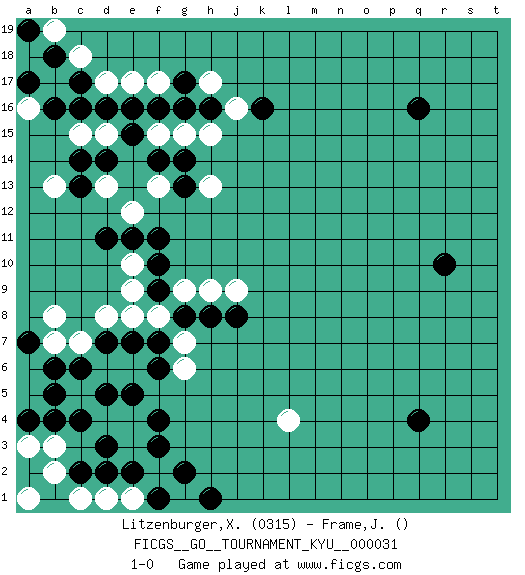 Last move : 1-0 2007 June 3 16:11:52 [Event "FICGS__GO__TOURNAMENT_KYU__000031"] [Site "FICGS"] [Date "2007.05.02"] [Round "1"] [Black "Litzenburger,Xavier"] [White "Frame,Jeremy"] [Result "1-0"] [Rating 1 "0315"] 1.d16 d6 2.q4 l4 3.q16 d13 4.c4 e4 5.d3 e3 6.c6 c7 7.b6 b7 8.e2 f2 9.c2 a6 10.b5 a5 11.a4 a3 12.b4 b3 13.a7 b8 14.r10 d4 15.d7 d8 16.e7 e8 17.f7 e1 18.d2 d1 19.d5 c1 20.b1 b2 21.f1 a1 22.e5 c1 23.f3 d1 24.f4 g1 25.g2 e6 26.f6 e1 27.h1 f8 28.d11 g7 29.f11 g6 30.g8 g9 31.h8 h9 32.j8 j9 33.f9 e9 34.f10 e10 35.e11 e12 36.c13 b13 37.c14 c15 38.d14 d15 39.e15 f15 40.e16 e17 41.f14 f13 42.g14 g15 43.g13 h13 44.k16 d17 45.c17 b17 46.c16 c18 47.f16 f17 48.g17 h17 49.h16 h15 50.g16 j16 51.b16 a16 52.b18 a18 53.a17 b19 54.a19 1-0 Here are the names of the openings (joseki) played in the four corners : Corner q4 : q4 l4 Hoshi (Hwajeom, Seongjeom, Xingwei`) 4-4 Point. The star or hoshi (4-4) point, emphasizing influence at the potential expense of territory. Corner d16 : d16 d13 Hoshi (Hwajeom, Seongjeom, Xingwei`) 4-4 Point. The star or hoshi (4-4) point, emphasizing influence at the potential expense of territory. Nikken Takagakari (Dukan Nop'dakeolch'im, E`r Gaojia, 2-Space High Approach). White 2 is a light approach move. Rarely played in even games, White 2 is typically employed in handicap games. Black continues with 6-4 or 3-10. In Korean Sunjang Baduk Black has a stone on 8-4. Corner d4 : d6 c4 Ootakamoku (Chaogao) 6-4 Point. The large takamoku (high) point (6-4), experimented with during the "new fuseki" movement in Japan in the 1930's. This point is seldom played as the initial corner point nowadays. Player Black won this Go (weiqi, baduk) game. Follow this game move after move (download)Don't try to enclose an open skirt. (Anonymous) If you ain't just a little scared when you enter a casino, you are either very rich or you haven't studied the games enough. (Pappy)