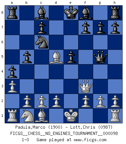Last move : 1-0 2018 June 30 5:5:48 [Event "FICGS__CHESS__NO_ENGINES_TOURNAMENT__000098"] [Site "FICGS"] [Date "2018.04.03"] [Round "1"] [White "Padula,Marco"] [Black "Lott,Chris"] [Result "1-0"] [WhiteElo "1900"] [BlackElo "0987"] 1.e4 e5 2.Nf3 Nc6 3.Bb5 a6 4.Ba4 b5 5.Bb3 a5 6.a3 a4 7.Ba2 Nf6 8.Ng5 d5 9.exd5 Nxd5 10.Qf3 Qxg5 11.Bxd5 1-0 Ruy Lopez : Caro variation Player White won this chess game. Follow this game move after move (download)If I win a tournament, I win it by myself. I do the playing. Nobody helps me. (Bobby Fischer) Bobby Fischer ist kein Vorbild für die heutige Jugend. (Viktor Kortschnoi) El Ajedrez demanda una total concentración. (Bobby Fischer) Le jeu d'échecs est comme rejeté hors du temps. (Antoine de Saint-Exupéry) Life is the sum of all your choices. (Albert Camus)