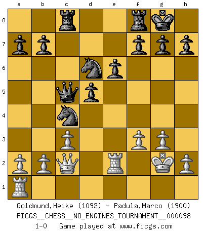 Last move : 1-0 2018 August 22 10:53:42 [Event "FICGS__CHESS__NO_ENGINES_TOURNAMENT__000098"] [Site "FICGS"] [Date "2018.04.03"] [Round "1"] [White "Goldmund,Heike"] [Black "Padula,Marco"] [Result "1-0"] [WhiteElo "1092"] [BlackElo "1900"] 1.e4 e6 2.Nf3 d5 3.e5 c5 4.d4 Nc6 5.Bb5 Bd7 6.c3 Nxe5 7.Bxd7+ Nxd7 8.O-O Ngf6 9.Bg5 Be7 10.Re1 O-O 11.Nbd2 Qb6 12.Qc2 Rac8 13.dxc5 Bxc5 14.Nd4 Bxd4 15.Nb3 Bc5 16.Bh4 Bd6 17.Nd4 Qxd4 18.g3 Qb6 19.Bg5 Ne4 20.Be3 Bc5 21.Bxc5 Qxc5 22.Kg2 Nb6 23.f3 Nd6 24.Re5 Nbc4 25.Re2 1-0 This chess game has been lost on time (started : 2018.04.03 23:19:52) French defense Kingside Castling by player White (move 8) Kingside Castling by player Black (move 10) Player White won this chess game. Follow this game move after move (download)In complicated positions, Bobby Fischer hardly had to be afraid of anybody. (Paul Keres) Kritik überlasse ich den Spießern. Ich zeige nichts, wofür ich mich schämen muss. (Alexandra Kosteniuk) El Ajedrez es un regaderazo frío para la mente. (Sir John Simon) D'abord les bases : Jouez et étudiez, puis étudiez et jouez, ensuite jouez et étudiez, puis étudiez et jouez. Deuxièmement : Donnez toujours le meilleur de vous-même ! (Ken Smith) Internal peace cannot coexist with external war. (Don Groves)