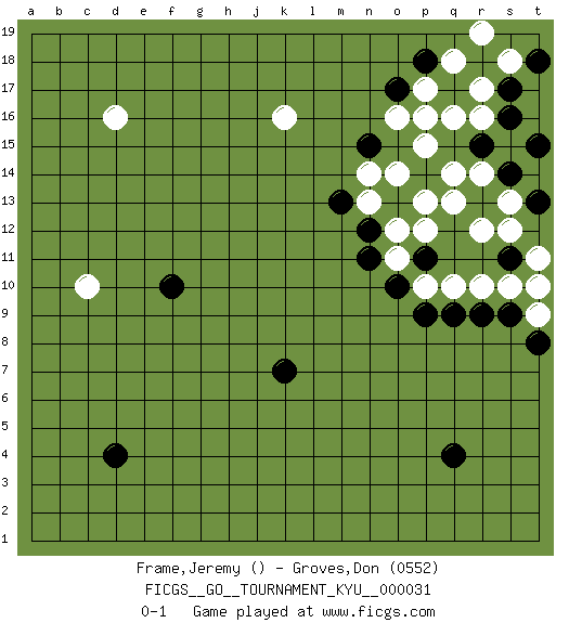 Last move : 0-1 2007 June 3 9:59:2 [Event "FICGS__GO__TOURNAMENT_KYU__000031"] [Site "FICGS"] [Date "2007.05.02"] [Round "1"] [Black "Frame,Jeremy"] [White "Groves,Don"] [Result "0-1"] [Rating 2 "0552"] 1.q4 d16 2.d4 q16 3.k7 k16 4.f10 q10 5.p9 p10 6.o10 q13 7.q9 r10 8.r9 c10 9.p11 o11 10.n11 o12 11.t10 s10 12.s9 t11 13.t12 t9 14.n12 p12 15.o13 n13 16.m13 n14 17.n15 o14 18.p14 p13 19.r13 p15 20.p16 q14 21.q17 p17 22.o17 o16 23.p18 p16 24.s11 t10 25.t8 s12 26.t13 s13 27.s14 t14 28.t15 r14 29.t13 r12 30.r15 r16 31.s16 r17 32.s17 s18 33.t18 q18 34.r18 r19 0-1 Here are the names of the openings (joseki) played in the four corners : Player White won this Go (weiqi, baduk) game. Follow this game move after move (download)Win the early ko to win the game. (Anonymous) We're missing something. (Gregory House, House M.D.)