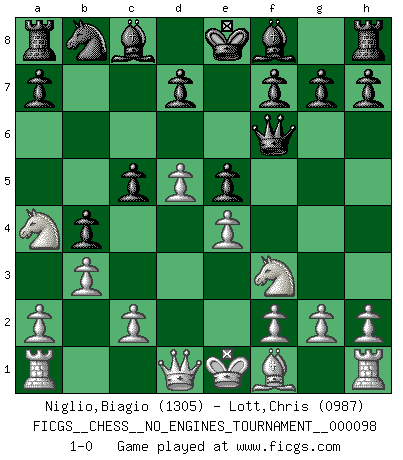 Last move : 1-0 2018 June 13 2:44:42 [Event "FICGS__CHESS__NO_ENGINES_TOURNAMENT__000098"] [Site "FICGS"] [Date "2018.04.03"] [Round "1"] [White "Niglio,Biagio"] [Black "Lott,Chris"] [Result "1-0"] [WhiteElo "1305"] [BlackElo "0987"] 1.d4 Nf6 2.Nf3 c5 3.d5 b5 4.Bg5 Qb6 5.Nc3 b4 6.Na4 Qd6 7.Bxf6 Qxf6 8.e4 e5 9.b3 1-0 This chess game has been lost on time (started : 2018.04.03 23:19:52) Queen's pawn game Player White won this chess game. Follow this game move after move (download)The Chess pieces are the block alphabet which shapes thoughts; and these thoughts, although making a visual design on the chessboard, express their beauty abstractly, like a poem. (Marcel Duchamp) Ich moechte nie einem Club beitreten, der Leute wie mich als Mitglieder aufnimmt. (Woody Allen) No nos podemos resistir a la fascinación de un sacrificio ya que la pasión por los sacrificios es parte de la naturaleza de un jugador de Ajedrez. (Rudolf Spielman) Toutes les manuvres exécutées sur une colonne ouverte ont pour but ultime l'intrusion définitive sur la septième ou la huitième rangée, en plein cur de la position ennemie. (Aaron Nimzovitch) You cannot beat a roulette table unless you steal money from it. (Albert Einstein)
