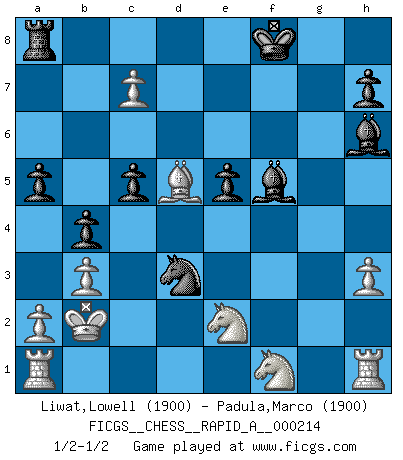 Last move : 1/2-1/2 2018 April 26 16:14:41 [Event "FICGS__CHESS__RAPID_A__000214"] [Site "FICGS"] [Date "2018.04.04"] [Round "1"] [White "Liwat,Lowell"] [Black "Padula,Marco"] [Result "1/2-1/2"] [WhiteElo "1900"] [BlackElo "1900"] 1.d4 Nf6 2.c4 c5 3.d5 b5 4.Nc3 b4 5.Nb1 g6 6.b3 Bg7 7.Bb2 O-O 8.Nd2 d6 9.e4 Qc7 10.Be2 Nbd7 11.g4 Ne5 12.h3 Bh6 13.f3 e6 14.Nf1 exd5 15.Bxe5 dxe5 16.cxd5 Ne8 17.Bc4 Nd6 18.Qd3 f5 19.gxf5 gxf5 20.Kd1 fxe4 21.fxe4 Rf4 22.Ne2 Rxe4 23.Qxe4 Nxe4 24.d6 Kf8 25.dxc7 a5 26.Bd5 Nf2+ 27.Kc2 Bf5+ 28.Kb2 Nd3+ 29.Kc2 Nf4 30.Kb2 Nd3+ 31.Kc2 Nf2 32.Kb2 Nd3+ 1/2-1/2 Benko gambit Kingside Castling by player Black (move 7) This chess game ended in a draw. Follow this game move after move (download)In Fischer's hands, a slight theoretical advantage is as good a being a Queen ahead. (Isaac Kashdan) Über die Verhaftung Bobby Fischers: Warum es die Bush-Administration für nötig befindet einen 61 Jahre alten Mann zu hetzten, der für niemanden ausser sich selbste eine Gefahr darstellt ist ein Rätsel. (Nigel Short) No hay precio que no valga la pena por la cabellera del Rey enemigo. (Koblentz) Botvinnik disait en comparant les échecs à la musique: Il existe une science dont le but est l'étude de l'acoustique et des sons. Mais il y a aussi un art qui se sert de l'océan des sons : c'est la musique. De toute évidence, il en est de même pour la pensée. La logique est l'étude des lois de la réflexion et les échecs reflètent, en tant qu'art, le côté logique de la réflexion, sous la forme d'images artistiques... Extrait de Fischer - Spassky, Reykjavik 1972 par Alexander & F. Wyndham (Ed. Solar), p 37. A good aphorism is too hard for the tooth of time, and is not worn away with the centuries, although it serves as food for every speech. (Friedrich Nietzsche)
