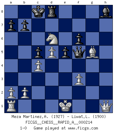 Last move : 1-0 2018 April 10 2:15:42 [Event "FICGS__CHESS__RAPID_A__000214"] [Site "FICGS"] [Date "2018.04.04"] [Round "1"] [White "Meza Martinez,Alcides Ivan"] [Black "Liwat,Lowell"] [Result "1-0"] [WhiteElo "1927"] [BlackElo "1900"] 1.d4 c5 2.d5 e5 3.c4 d6 4.Nc3 Na6 5.e4 Nc7 6.Bd3 g5 7.h3 h5 8.Be2 h4 9.Nf3 g4 10.hxg4 Bxg4 11.g3 h3 12.Nh4 Bxe2 13.Qxe2 Qd7 14.Qf1 Be7 15.Nf5 O-O-O 16.Rxh3 Nf6 17.Qh1 Rhg8 18.f3 Nce8 19.g4 Ng7 20.g5 Nxf5 21.exf5 Qxf5 22.gxf6 Bxf6 23.Ne4 Rh8 24.Rxh8 Bxh8 25.Bg5 f6 26.Nxd6+ 1-0 Old Benoni defense Queenside Castling by player Black (move 15) Player White won this chess game. Follow this game move after move (download)Every Pawn is a potential Queen. (James Mason) Bogoljubow: Matt in vier Zügen! Tartakower: Ich verbitte mir jede Belästigung! (Savielly Grigorievitsch Tartakower) Un jugador que trata de regresar una movida en el Ajedrez es un futuro carterista. (Richard Fenton) La vérité est comme le meilleur coup aux échecs : elle existe, mais il faut la chercher. (Arturo Perez-Reverte) Either move or be moved. (Ezra Pound)