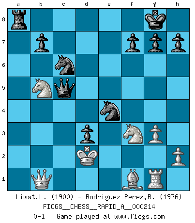 Last move : 0-1 2018 May 26 1:35:5 [Event "FICGS__CHESS__RAPID_A__000214"] [Site "FICGS"] [Date "2018.04.04"] [Round "1"] [White "Liwat,Lowell"] [Black "Rodriguez Perez,Rene"] [Result "0-1"] [WhiteElo "1900"] [BlackElo "1976"] 1.d4 d5 2.c4 e6 3.Nc3 Nf6 4.a3 c5 5.dxc5 Bxc5 6.b4 Be7 7.c5 O-O 8.e3 a5 9.Bb2 axb4 10.axb4 Rxa1 11.Bxa1 Nc6 12.Qb1 e5 13.Nf3 d4 14.exd4 exd4 15.Nb5 Bxc5 16.bxc5 Qa5+ 17.Kd1 Ng4 18.Rg1 Bf5 19.Qxf5 Qxa1+ 20.Kd2 Qb2+ 21.Qc2 Qb4+ 22.Kd1 Nxf2+ 23.Kc1 Ra8 24.Qb1 Qxc5+ 25.Kd2 d3 26.g3 Ne4+ 0-1 QGD : 3...Nf6 Kingside Castling by player Black (move 7) Player Black won this chess game. Follow this game move after move (download)When the Chess game is over, the Pawn and the King go back to the same box. (Irish saying) Ich bewundere Kasparows phantasievolle Angriffssiege aus den Achtzigern und Neunzigern, aber wenn man sie mit dem Computer überprüft, nimmt der Computer in jeder zweiten Partie die Opfer an, verteidigt sich und gewinnt. (Vladimir Kramnik) Un entendimiento a fondo de las continuaciones típicas del mate, hace de las combinaciones de sacrificio mas complicadas conducirlas a ellas no solo sin dificultad, sino casi de una manera natural. (Siegbert Tarrasch) Les Echecs mettent en conflit, non pas deux intelligences, mais deux volontés. (Lasker) As a goal marker shodan is important. As a destination it is a poor place to stop. (Thomas Tamayo)