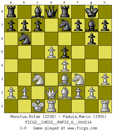 Last move : 1-0 2018 June 27 4:11:56 [Event "FICGS__CHESS__RAPID_A__000214"] [Site "FICGS"] [Date "2018.04.04"] [Round "1"] [White "Monotua,Rotom"] [Black "Padula,Marco"] [Result "1-0"] [WhiteElo "2238"] [BlackElo "1900"] 1.d4 Nf6 2.c4 d5 3.cxd5 Nxd5 4.Nf3 g6 5.e4 Nb6 6.h3 Bg7 7.Nc3 O-O 8.Be3 Nc6 9.Qd2 Re8 10.Be2 e5 11.d5 Ne7 12.O-O-O 1-0 This chess game has been lost on time (started : 2018.04.04 0:1:18) Queen's pawn game Kingside Castling by player Black (move 7) Queenside Castling by player White (move 12) Player White won this chess game. Follow this game move after move (download)Robert Fischer is a law unto himself. (Larry Evans) Wenn Schach ein enormer Dschungel ist, der seine Myriaden von Geheimnissen nicht preisgeben will, dann sind Computer die Kettensägen einer gewaltigen ökologisch unsensiblen Nutzholzfirma. (Nigel Short) Aquellos que dicen que entienden al Ajedrez, no entienden nada. (Robert Hubner) Mon pion favori sur ma case favorite ! Bronstein en parlant d'un coup de pion en h5 quand il avait les Noirs. Internet: Absolute communication, absolute isolation. (Paul Carvel)