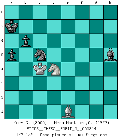 Last move : 1/2-1/2 2018 August 21 5:26:20 [Event "FICGS__CHESS__RAPID_A__000214"] [Site "FICGS"] [Date "2018.04.04"] [Round "1"] [White "Kerr,Graham"] [Black "Meza Martinez,Alcides Ivan"] [Result "1/2-1/2"] [WhiteElo "2000"] [BlackElo "1927"] 1.e4 e6 2.d4 d5 3.Nc3 Bb4 4.e5 c5 5.a3 Bxc3+ 6.bxc3 Qa5 7.Bd2 Qa4 8.Qb1 c4 9.Be2 Nc6 10.Nh3 Nge7 11.Nf4 Bd7 12.O-O O-O-O 13.Nh5 Rhg8 14.Qb2 b6 15.Bf3 Rdf8 16.Rfe1 Kb7 17.g3 h6 18.Bg2 Nf5 19.Re2 Be8 20.Rae1 Bd7 21.Qa1 a5 22.Bc1 Na7 23.Bb2 Ka6 24.Bh3 Qc6 25.Bc1 Nb5 26.Bd2 Nc7 27.Qb2 Be8 28.Nf4 Ne7 29.Ng2 Qb5 30.Rb1 Qxb2 31.Rxb2 Nb5 32.a4 Nc7 33.Ra2 g5 34.Ne3 h5 35.Bf1 f5 36.exf6 Rxf6 37.Ng2 h4 38.g4 Bd7 39.h3 Ne8 40.Re5 Rfg6 41.f4 gxf4 42.Bxf4 R6g7 43.Nxh4 Nf6 44.Ng2 Ne4 45.Rxe4 dxe4 46.Ne3 Ka7 47.Be5 Rf7 48.Bg2 Nd5 49.Nxc4 e3 50.Ra1 e2 51.Bg3 R7f8 52.Ne5 Be8 53.Bf3 Rxf3 54.Nxf3 Rf8 55.Nd2 Nxc3 56.Ra3 Nb1 57.Rf3 Rxf3 58.Nxf3 Bxa4 59.c4 Nc3 60.h4 Bc6 61.d5 exd5 62.Be1 Nd1 63.Nd4 Be8 64.cxd5 Ne3 65.Kf2 Nxg4+ 66.Kxe2 Nf6 67.d6 Ne4 68.d7 Bxd7 69.h5 Bg4+ 70.Kd3 Nc5+ 71.Kc4 Bxh5 1/2-1/2 French : Winawer, Advance variation Kingside Castling by player White (move 12) Queenside Castling by player Black (move 12) 10 pieces endgame at move 66 : White KBNPP , Black KBNPP WHITE : King + 1 Bishop 1 Knight 2 Pawns BLACK : King + 1 Bishop 1 Knight 2 Pawns 9 pieces endgame at move 68 : White KBNP , Black KBNPP WHITE : King + 1 Bishop 1 Knight 1 Pawn BLACK : King + 1 Bishop 1 Knight 2 Pawns 8 pieces endgame at move 71 : White KBN , Black KBNPP WHITE : King + 1 Bishop 1 Knight BLACK : King + 1 Bishop 1 Knight 2 Pawns This chess game ended in a draw. Follow this game move after move (download)In blitz, the Knight is stronger than the Bishop. (Vlastimil Hort) Korrekt heißt in Deutschland die Haltung eines Mannes, dessen Benehmen nach dem Urteile seiner Nachbarn seiner Stellung angemessen ist. Um korrekt zu sein, muß man sich der Meinung der anderen anpassen... (Emanuel Lasker) El Ajedrez detiene a su maestro dentro de sus propios vínculos, encadenando la mente y el cerebro, por lo que la libertad interior del mas fuerte debe sufrir. (Albert Einstein) Le moment que je préfère le plus dans une rencontre, c'est celui où je sens que la personnalité de l'adversaire se brise. (Robert Fischer) Knowledge will give you power, but character respect. (Bruce Lee)