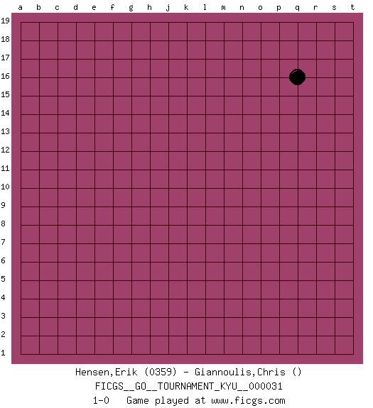Last move : 1-0 2007 June 1 17:47:25 [Event "FICGS__GO__TOURNAMENT_KYU__000031"] [Site "FICGS"] [Date "2007.05.02"] [Round "1"] [Black "Hensen,Erik"] [White "Giannoulis,Chris"] [Result "1-0"] [Rating 1 "0359"] 1.q16 1-0 This go game has been lost on time (started : 2007.05.02 0:45:32) Here are the names of the openings (joseki) played in the four corners : Player Black won this Go (weiqi, baduk) game. Follow this game move after move (download)Five liberties for tactical stability. (Anonymous) A good book on your shelf is a friend that turns its back on you and remains a friend. (Author unknown)