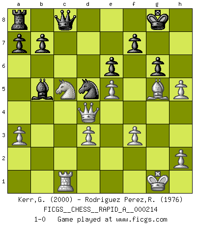 Last move : 1-0 2018 June 11 22:53:31 [Event "FICGS__CHESS__RAPID_A__000214"] [Site "FICGS"] [Date "2018.04.04"] [Round "1"] [White "Kerr,Graham"] [Black "Rodriguez Perez,Rene"] [Result "1-0"] [WhiteElo "2000"] [BlackElo "1976"] 1.e4 e6 2.d4 d5 3.Nc3 Nf6 4.Bg5 Bb4 5.e5 h6 6.Be3 Ne4 7.Qg4 g6 8.a3 Bxc3+ 9.bxc3 c5 10.Bd3 h5 11.Qf3 Nxc3 12.dxc5 d4 13.Bd2 Nd7 14.Qf4 Nxc5 15.Nf3 Nxd3+ 16.cxd3 Bd7 17.Ng5 Qe7 18.Qxd4 Nd5 19.Ne4 Bc6 20.O-O O-O 21.Rfc1 Rfc8 22.Bg5 Qd7 23.Rc5 Kh8 24.Rac1 Bb5 25.g4 Rxc5 26.Nxc5 Qc8 27.f3 Kg8 28.gxh5 1-0 Graham Kerr thanks... gg ;-) French : MacCutcheon, Janowski variation Kingside Castling by player White (move 20) Kingside Castling by player Black (move 20) Player White won this chess game. Follow this game move after move (download)Discovered check is the dive bomber of the Chessboard. (Reuben Fine) Obwohl ich alt bin, darf mir niemand den Finger in den Mund stecken, sonst beisse ich. (Wilhelm Steinitz) En la perfecta combinación de Ajedrez como en una historia corta de primera clase, toda la trama y contra trama deberá conducir hacia un final sorprendente, el interes no es mitigado hasta el último momento. (Yates and Winter) On n'a jamais que l'âge auquel on a commence à jouer aux échecs car après on cesse de vieillir. (Capablanca) Real knowledge is to know the extent of one's ignorance. (Confucius)