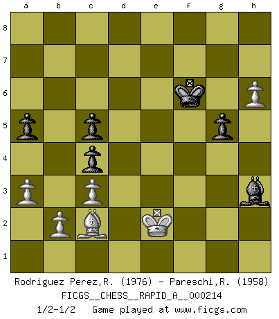 Last move : 1/2-1/2 2018 September 20 18:4:19 [Event "FICGS__CHESS__RAPID_A__000214"] [Site "FICGS"] [Date "2018.04.04"] [Round "1"] [White "Rodriguez Perez,Rene"] [Black "Pareschi,Remo"] [Result "1/2-1/2"] [WhiteElo "1976"] [BlackElo "1958"] 1.e4 e5 2.Nf3 Nc6 3.d4 exd4 4.Nxd4 Bc5 5.Be3 Qf6 6.c3 Nge7 7.Bc4 Ne5 8.Be2 Qg6 9.O-O d6 10.f3 O-O 11.Nd2 f5 12.exf5 Nxf5 13.Nxf5 Bxf5 14.Bxc5 dxc5 15.Qb3+ Qf7 16.Qxf7+ Rxf7 17.Nc4 Re7 18.Nxe5 Rxe5 19.Rfe1 Rae8 20.Bc4+ Kf8 21.Rxe5 Rxe5 22.Kf2 Re7 23.Rd1 Rd7 24.Rd5 Rxd5 25.Bxd5 c6 26.Bb3 Ke7 27.g4 Bb1 28.f4 h6 29.a3 Kf6 30.Ke3 g5 31.Kf3 a5 32.Kg3 Be4 33.Bd1 Bg6 34.h4 Bf7 35.fxg5+ hxg5 36.h5 Be6 37.Be2 Kg7 38.Kf3 Bd5+ 39.Kg3 Be6 40.Bd3 c4 41.Be2 Bd5 42.Kf2 c5 43.Ke3 Kf6 44.Bf3 Be6 45.h6 Bd7 46.Bxb7 Bxg4 47.Be4 Be6 48.Kf3 Kf7 49.Bc2 Bh3 50.Ke2 Kf6 1/2-1/2 Scotch game Kingside Castling by player White (move 9) Kingside Castling by player Black (move 10) This chess game ended in a draw. Follow this game move after move (download)The battle for the ultimate truth will never be won. And that's why Chess is so fascinating. (Hans Kmoch) Bobby Fischer ist kein Vorbild für die heutige Jugend. (Viktor Kortschnoi) Fischer no está bajo la obligación de nadie. (Joseph Platz) Même si l'adversaire joue le coup analysé précédemment, recommencez l'analyse en voyant la nouvelle position. Première règle de Blumenfeld If you are going through hell, keep going. (Winston Churchill)