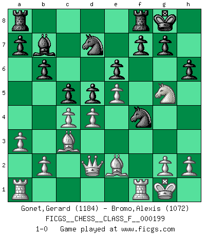 Last move : 1-0 2018 April 8 15:10:14 [Event "FICGS__CHESS__CLASS_F__000199"] [Site "FICGS"] [Date "2018.04.04"] [Round "1"] [White "Gonet,Gerard"] [Black "Bromo,Alexis"] [Result "1-0"] [WhiteElo "1184"] [BlackElo "1072"] 1.d4 d5 2.e4 c6 3.c4 e6 4.Nc3 h6 5.e5 Bb4 6.Bd2 Ne7 7.Be2 Ng6 8.Nf3 Nd7 9.O-O O-O 10.a3 Bxc3 11.Bxc3 b6 12.Nd2 Bb7 13.f4 c5 14.Nf3 Nxf4 15.Qd2 Qg5 16.Nxg5 1-0 Blackmar gambit Kingside Castling by player White (move 9) Kingside Castling by player Black (move 9) Player White won this chess game. Follow this game move after move (download)There are tough players and nice guys, and I'm a tough player. (Bobby Fischer) Vom Schach wurde gesagt das Leben sei dafür nicht lange genug. Aber das ist der Fehler des Lebens, nicht des Schach'. (Irving Chernev) Alekhine es un poeta que crea un trabajo de arte de algo que raramente inspiraría a otra persona a mandar una tarjeta postal. (Max Euwe) J'ai vu le vaincu d'Echecs jouer des années durant dans l'espoir de la fête de la victoire. Car tu es plus riche de ce qu'elle existe si même elle n'est point pour toi. Ainsi de la perle du fond des mers. (Antoine de Saint-Exupéry) Man is still the most extraordinary computer of all. (John F. Kennedy)