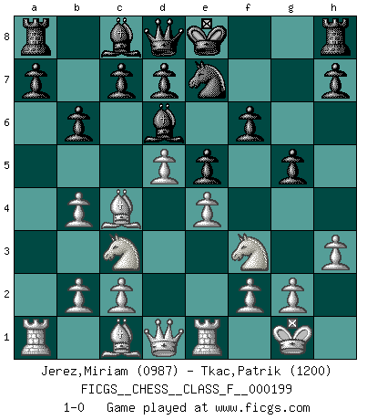 Last move : 1-0 2018 July 16 19:49:4 [Event "FICGS__CHESS__CLASS_F__000199"] [Site "FICGS"] [Date "2018.04.04"] [Round "1"] [White "Jerez,Miriam"] [Black "Tkac,Patrik"] [Result "1-0"] [WhiteElo "0987"] [BlackElo "1200"] 1.e4 e5 2.Nf3 f6 3.Nc3 Bc5 4.Bc4 g5 5.d4 Bf8 6.O-O Bd6 7.h3 Ne7 8.d5 Na6 9.Re1 Nb4 10.a3 b6 11.axb4 1-0 This chess game has been lost on time (started : 2018.04.04 17:13:53) Damiano's defense Kingside Castling by player White (move 6) Player White won this chess game. Follow this game move after move (download)My opponents make good moves too. Sometimes I don't take these things into consideration. (Bobby Fischer) Ich las kürzlich ein Buch von Nietzsche. Er sagte Religion verdumme nur die Menschen. Ich stimme zu. (Robert James Fischer) Nos gusta pensar. (Gary Kasparov) J'apprécie les joueurs d'est-indienne, c'est grâce à eux que je nourris ma famille depuis tant d'années. (Petrosian) Nobody is always a winner, and anybody who says he is, is either a liar or doesn't play poker. (Amarillo Slim)