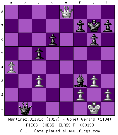 Last move : 0-1 2018 July 30 20:50:26 [Event "FICGS__CHESS__CLASS_F__000199"] [Site "FICGS"] [Date "2018.04.04"] [Round "1"] [White "Martinez,Silvio"] [Black "Gonet,Gerard"] [Result "0-1"] [WhiteElo "1027"] [BlackElo "1184"] 1.e4 e5 2.d4 exd4 3.Qxd4 Nc6 4.Qd1 Nf6 5.Nc3 Bb4 6.Bd2 O-O 7.Nf3 d6 8.Bb5 Bd7 9.O-O a6 10.Bxc6 Bxc6 11.a3 Bxc3 12.Bxc3 Nxe4 13.Re1 Nxc3 14.bxc3 Qf6 15.Qd3 Rae8 16.Nd4 Bd7 17.Nf3 Bf5 18.Qc4 c5 19.Rac1 b5 20.Qd5 Qg6 21.g3 Bxc2 22.Qc6 Be4 23.Qxa6 Bxf3 24.Qxb5 Rxe1+ 25.Rxe1 Qf5 26.Re8 g6 27.Qb8 Rxe8 28.Qxe8+ Kg7 29.a4 Qb1+ 0-1 Centre game Kingside Castling by player Black (move 6) Kingside Castling by player White (move 9) Player Black won this chess game. Follow this game move after move (download)If a ruler does not understand Chess, how can he rule over a kingdom ? (King Khusros II) Pläne sind die Träume des Verständigen. (Ernst Freiherr von Feuchtersleben) Yo tuve un dolor de muelas en la primer partida. En el segundo juego, tuve un dolor de cabeza. En el tercero, tuve un ataque de reumatísmo. En la cuarta partida, no me sentía muy bien. ¿Y en el quinto juego? Bueno, ¿que acaso uno tiene que ganar todos los juegos?. (Siegbert Tarrasch) Le temps de noter son nom sur la feuille de partie, j'étais déjà en zeitnot ! D'un modeste amateur apparié lors de la première ronde d'un open contre le grand-maître Azmaïparashvili. Methinks King Thibault should dub Marius Zubac a knight of the square board... I mean table, henceforth addressing him as Sir Marius, and bestow on him a suitable land from the kingdom of FICGS & marry him off to a worthy, fair maiden, lest he slice our heads with his mighty sword in his wrath. (Dinesh De Silva)