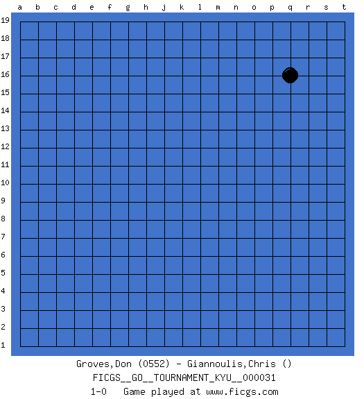 Last move : 1-0 2007 June 1 5:46:27 [Event "FICGS__GO__TOURNAMENT_KYU__000031"] [Site "FICGS"] [Date "2007.05.02"] [Round "1"] [Black "Groves,Don"] [White "Giannoulis,Chris"] [Result "1-0"] [Rating 1 "0552"] 1.q16 1-0 This go game has been lost on time (started : 2007.05.02 0:45:32) Here are the names of the openings (joseki) played in the four corners : Player Black won this Go (weiqi, baduk) game. Follow this game move after move (download)One point in the center is worth ten in the corner. (Anonymous) Programmer - an organism that turns coffee into software. (Anonymous)