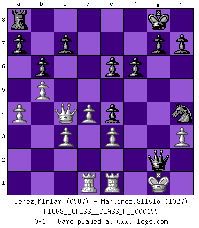 Last move : 0-1 2018 May 28 3:30:30 [Event "FICGS__CHESS__CLASS_F__000199"] [Site "FICGS"] [Date "2018.04.04"] [Round "1"] [White "Jerez,Miriam"] [Black "Martinez,Silvio"] [Result "0-1"] [WhiteElo "0987"] [BlackElo "1027"] 1.Nf3 Nf6 2.Nc3 d5 3.d4 Nc6 4.Bf4 Bf5 5.e3 e6 6.Bb5 Bb4 7.O-O O-O 8.Ne5 Bxc3 9.bxc3 Ne4 10.c4 Nc3 11.Qd2 Nxb5 12.cxb5 Ne7 13.Rfe1 f6 14.Nd3 Re8 15.a4 Ng6 16.h3 b6 17.Nb4 Nh4 18.c3 Re7 19.Nc6 Qe8 20.Nxe7+ Qxe7 21.Qe2 Qf7 22.Rad1 Qg6 23.Bg3 Be4 24.f3 Qxg3 25.fxe4 dxe4 26.Qc4 Qxg2+ 0-1 Reti Opening Kingside Castling by player White (move 7) Kingside Castling by player Black (move 7) Player Black won this chess game. Follow this game move after move (download)Half the variations which are calculated in a tournament game turn out to be completely superfluous. Unfortunately, no one knows in advance which half. (Jan Tinman) Ein Schachgenie ist jemand der verdammt gut Schach spielt. (Jonathan Levitt) Siempre es mejor sacrificar los hombres de tu oponente. (Savielly Tartakower) Les échecs sont un jeu par leur forme, un art par leur essence et une science par sa difficulté d'acquisition. Ils peuvent vous procurer autant de plaisir qu'un bon livre ou une belle musique, mais vous n'aurez une réelle joie que si vous arrivez à bien jouer. (Tigran Petrosian) Good decisions come from experience, and experience comes from bad decisions. (Anonymous)