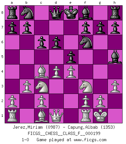 Last move : 1-0 2018 May 19 23:36:18 [Event "FICGS__CHESS__CLASS_F__000199"] [Site "FICGS"] [Date "2018.04.04"] [Round "1"] [White "Jerez,Miriam"] [Black "Capung,Albab"] [Result "1-0"] [WhiteElo "0987"] [BlackElo "1353"] 1.e4 e6 2.Nf3 c6 3.b3 d6 4.Nc3 e5 5.Bc4 Bg4 6.O-O Nf6 7.h3 Bh5 8.d4 1-0 This chess game has been lost on time (started : 2018.04.04 17:13:53) French defense Kingside Castling by player White (move 6) Player White won this chess game. Follow this game move after move (download)Personally, I rather look forward to a computer program winning the world Chess Championship. Humanity needs a lesson in humility. (Richard Dawkings) Es gibt Leute, die glauben, alles wäre vernünftig, was man mit einem ernsthaften Gesicht tut. (Georg Christoph Lichtenberg) Un mal día en el Ajedrez, es mejor que cualquier buen día en el trabajo. (Anonymous) Toutes choses étant égales, c'est la conviction qui gagne. Alliée à une volonté de vaincre, elle sert de détonateur, suscite des idées, disperse les doutes et aide à penser clairement. (Robert Fischer) May the force be with you. (Han Solo in Star Wars ep.4)