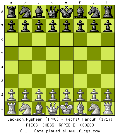 Last move : 0-1 2018 May 4 22:35:41 [Event "FICGS__CHESS__RAPID_B__000269"] [Site "FICGS"] [Date "2018.04.04"] [Round "1"] [White "Jackson,Rysheen"] [Black "Kechat,Farouk"] [Result "0-1"] [WhiteElo "1700"] [BlackElo "1717"] 0-1 This chess game has been lost on time (started : 2018.04.04 19:22:59) Player Black won this chess game. Follow this game move after move (download)When you absolutely don't know what to do anymore, it is time to panic. (John van der Wiel) Im Blitz ist es einfacher mit einer Figur weniger anzugreifen, als sich mit einer Mehrfigur zu verteidigen. (Mikhail Nekhemyevich Tal) Mi estilo es algo parecido entre un poco de Tal y Petrosian. (Reshevsky) Le plus grand jeu de l'esprit jamais inventé, plus vous l'apprenez, plus vous y prenez du plaisir. (Garry Kasparov) The greatest con, that he ever pulled... was making you believe... that he is you. (Revolver, movie)