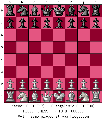 Last move : 0-1 2018 May 4 22:35:41 [Event "FICGS__CHESS__RAPID_B__000269"] [Site "FICGS"] [Date "2018.04.04"] [Round "1"] [White "Kechat,Farouk"] [Black "Evangelista,Cristiano"] [Result "0-1"] [WhiteElo "1717"] [BlackElo "1700"] 0-1 This chess game has been lost on time (started : 2018.04.04 19:22:59) Player Black won this chess game. Follow this game move after move (download)Chess is a fairy tale of 1001 blunders. (Savielly Tartakower) Wenn ich gewinne bin ich ein Genie. Wenn nicht, dann bin ich keines. (Robert James Fischer) En el Ajedrez, tal como es jugado por los Maestros, practicamente la suerte es eliminada. (Emanuel Lasker) Votre seul travail dans les ouvertures est d'obtenir un milieu de partie jouable. (Lajos Portish) The beginning is the most important part of the work. (Plato)