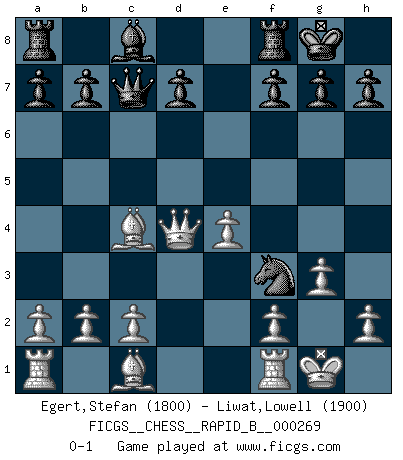Last move : 0-1 2018 May 21 11:44:43 [Event "FICGS__CHESS__RAPID_B__000269"] [Site "FICGS"] [Date "2018.04.04"] [Round "1"] [White "Egert,Stefan"] [Black "Liwat,Lowell"] [Result "0-1"] [WhiteElo "1800"] [BlackElo "1900"] 1.d4 c5 2.e4 cxd4 3.Qxd4 Nc6 4.Qd1 e5 5.Bb5 Nd4 6.Qd3 Qa5+ 7.Nc3 Bb4 8.Nge2 Nf6 9.O-O O-O 10.Nxd4 exd4 11.Ne2 Bc5 12.Bc4 Qc7 13.Nxd4 Ng4 14.g3 Ne5 15.Qc3 Bxd4 16.Qxd4 Nf3+ 0-1 This chess game has been lost on time (started : 2018.04.04 19:22:59) Old Benoni defense Kingside Castling by player White (move 9) Kingside Castling by player Black (move 9) Player Black won this chess game. Follow this game move after move (download)When I have White, I win because I am white; When I have Black, I win because I am Bogolyubov. (Bogolyubov) Der Traum, für den ich lebe, ist der von einem freien Russland. Viele mögen sagen: Russland hat doch ein Parlament, einen gewählten Präsidenten. Aber ich spüre, dass in meiner Heimat die Angst wiederkehrt. Eine Angst, sich frei zu äußern, bestimmte Dinge zu tun (Garry Kasparov) Yo jugué Ajedrez con el y a veces le pude haber ganado solo que siempre devuelve su última jugada y juega la partida de manera diferente. (Mark Twain) C'est la seule position que je connaisse où les deux camps sont mals. Propos prêtés à V. Anand. A clear conscience is usually the sign of a bad memory. (Unknown)