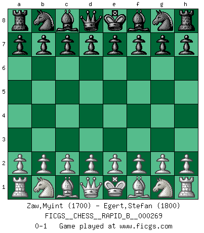 Last move : 0-1 2018 May 4 22:35:41 [Event "FICGS__CHESS__RAPID_B__000269"] [Site "FICGS"] [Date "2018.04.04"] [Round "1"] [White "Zaw,Myint"] [Black "Egert,Stefan"] [Result "0-1"] [WhiteElo "1700"] [BlackElo "1800"] 0-1 This chess game has been lost on time (started : 2018.04.04 19:22:59) Player Black won this chess game. Follow this game move after move (download)It is difficult to play against Einstein's theory --on his first loss to Fischer. (Mikhail Tal) Wenn man heute mit 14 Jahren noch kein GM ist, kann man es vergessen. (Viswanathan Anand) A través de las casillas del tablero, los Indios explican el movimiento del tiempo y la edad, las influencias mas altas que controlan el mundo y los lazos que vinculan al Ajedrez con el alma humana. (Al-Masudi) Les Echecs, c'est l'art de la guerre sans les charniers, c'est la résurrection des morts tombés au champ d'honneur, l'espoir perpétuel, la suprématie de l'intelligence sur la force, la culture de l'esprit. (F. Szpiner) War is the child of passion, passion is the child of narcissism and narcissism is the child. (...) Another game ? (Thibault de Vassal)
