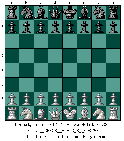 Last move : 0-1 2018 May 4 22:35:41 [Event "FICGS__CHESS__RAPID_B__000269"] [Site "FICGS"] [Date "2018.04.04"] [Round "1"] [White "Kechat,Farouk"] [Black "Zaw,Myint"] [Result "0-1"] [WhiteElo "1717"] [BlackElo "1700"] 0-1 This chess game has been lost on time (started : 2018.04.04 19:22:59) Player Black won this chess game. Follow this game move after move (download)You may learn much more from a game you lose than from a game you win. You will have to lose hundreds of games before becoming a good player. (Jose Raul Capablanca) Mit Schach schule ich mein Gefühl für Geometrie, was für Tennis und Schach gleichermaßen wichtig ist. (Boris Becker) En posiciones complicadas, Bobby Fischer pocas veces tuvo que temer de cualquiera. (Paul Keres) Toutes choses étant égales, c'est la conviction qui gagne. Alliée à une volonté de vaincre, elle sert de détonateur, suscite des idées, disperse les doutes et aide à penser clairement. (Robert Fischer) Men should grow up. - Yeah. And dogs should stop licking themselves. It's not gonna happen. (Gregory House to Dr. Cameron, House M.D.)