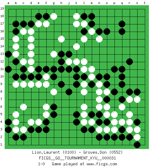 Last move : 1-0 2007 June 29 6:36:0 [Event "FICGS__GO__TOURNAMENT_KYU__000031"] [Site "FICGS"] [Date "2007.05.02"] [Round "1"] [Black "Lion,Laurent"] [White "Groves,Don"] [Result "1-0"] [Rating 1 "0100"] [Rating 2 "0552"] 1.q16 d4 2.q3 d16 3.f3 c6 4.k4 r5 5.r8 p5 6.o4 s3 7.r2 s2 8.s1 r3 9.q2 q4 10.s4 r4 11.q17 k17 12.c14 c12 13.c17 c16 14.d17 e17 15.e18 f17 16.f18 g18 17.b16 d14 18.c15 d15 19.d3 c3 20.e3 e4 21.r12 d9 22.m17 l15 23.f4 f5 24.g5 f6 25.g6 s7 26.s8 r7 27.j11 o5 28.n4 p3 29.p2 o3 30.n2 p4 31.o2 q8 32.q9 p9 33.q10 n15 34.o16 k14 35.n5 p10 36.q11 n6 37.p11 g8 38.p8 o8 39.q7 q6 40.o7 n9 41.o10 n7 42.o9 n8 43.n10 o6 44.l10 l12 45.g11 g13 46.c13 d13 47.b12 b11 48.c11 d12 49.b10 b13 50.a11 b15 51.a13 b14 52.b17 c9 53.d10 d11 54.c10 b9 55.e10 f10 56.f11 e9 57.g10 f9 58.e11 n3 59.m3 m4 60.m5 l4 61.l3 l5 62.k5 l6 63.l18 k18 64.c2 b3 65.b2 h10 66.h11 j10 67.k11 l11 68.k10 m10 69.h9 j9 70.m9 m11 71.j8 l9 72.k9 l8 73.j13 k12 74.h13 j12 75.h12 h15 76.a3 b4 77.a4 b5 78.l16 l17 79.m18 m16 80.n16 1-0 Here are the names of the openings (joseki) played in the four corners : Corner d4 : d4 f3 Hoshi (Hwajeom, Seongjeom, Xingwei`) 4-4 Point. The star or hoshi (4-4) point, emphasizing influence at the potential expense of territory. Ikken Kakari (Hankan Keolch'im, Yi Gua`jiao~, 1-Space Low Approach). Black 2 is the standard approach move to the 4-4. Corner q4 : q3 r5 Komoku (Somok, Xiao~mu`) 3-4 Point. The komoku (3-4) point is the traditional corner enclosure move.. Ikken Kakari (Hankan Keolch'im, Yi Gua`jiao~, 1-Space Low Pincer). The small knight move is the basic approach move to the 3-4 point stone. It has been continually used for over four centuries. There are limitless variations, with new moves constantly being discovered. White 2 opens the door to a treaure store of joseki. Corner d16 : d16 c14 Hoshi (Hwajeom, Seongjeom, Xingwei`) 4-4 Point. The star or hoshi (4-4) point, emphasizing influence at the potential expense of territory. Ikken Kakari (Hankan Keolch'im, Yi Gua`jiao~, 1-Space Low Approach). Black 2 is the standard approach move to the 4-4. Player Black won this Go (weiqi, baduk) game. Follow this game move after move (download)Go is not a blocking game, it's a game of action. (Pierre Audouard) He who laughs last probably does not get the joke. (Unknown)