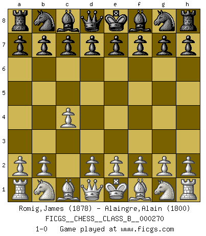Last move : 1-0 2018 May 14 23:17:28 [Event "FICGS__CHESS__CLASS_B__000270"] [Site "FICGS"] [Date "2018.04.04"] [Round "1"] [White "Romig,James"] [Black "Alaingre,Alain"] [Result "1-0"] [WhiteElo "1878"] [BlackElo "1800"] 1.c4 1-0 This chess game has been lost on time (started : 2018.04.04 19:23:43) English Opening Player White won this chess game. Follow this game move after move (download)A man that will take back a move at Chess will pick a pocket. (Richard Fenton) Computer sind die einzigen Gegner, die nicht immer eine Ausrede auf Lager haben, wenn sie gegen mich verlieren. (Robert James Fischer) La última cosa en que Fischer estaba interesado era en tonterías, siempre y cuando el Ajedrez estuviera involucrado. (Elie Agur) Vous m'avez demandé de vous exposer quel est le fondement de la prière. Je ne fais que préparer les pièces du jeu sur la table... Nous sera-t-il permis d'en adopter les règles et si nous les appliquons scrupuleusement nous ne tarderons pas à faire mat le Roi divin ! Il ne pourra échapper à nos mains. (Sainte Thérèse d'Avila, Chemin de perfection) My poor ole parrot... Is not in the circulation of displays ....poo hoo hoo :) (Wayne Lowrance's enigma)