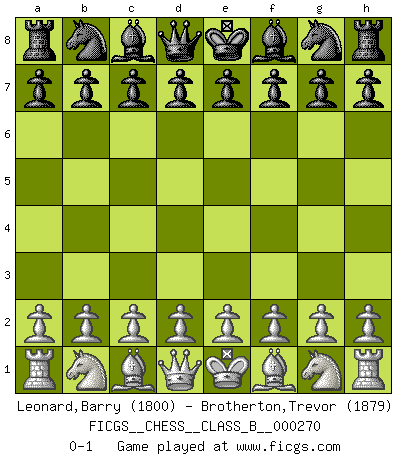 Last move : 0-1 2018 May 14 23:17:28 [Event "FICGS__CHESS__CLASS_B__000270"] [Site "FICGS"] [Date "2018.04.04"] [Round "1"] [White "Leonard,Barry"] [Black "Brotherton,Trevor"] [Result "0-1"] [WhiteElo "1800"] [BlackElo "1879"] 0-1 This chess game has been lost on time (started : 2018.04.04 19:23:43) Player Black won this chess game. Follow this game move after move (download)Chess is a fighting game which is purely intellectual and includes chance. (Richard Reti) Alles was ich jemals tun will ist Schach spielen. (Robert James Fischer) No es tiempo de jugar al Ajedrez cuando la casa esta en llamas. (Proverbio Italiano) Le système Elo représente seulement une moyenne. Il est simplement un indicateur de votre stabilité. (Anatoli Karpov) Nothing is more important for teaching us to understand the concepts we have than constructing fictitious ones. (Ludwig Wittgenstein)