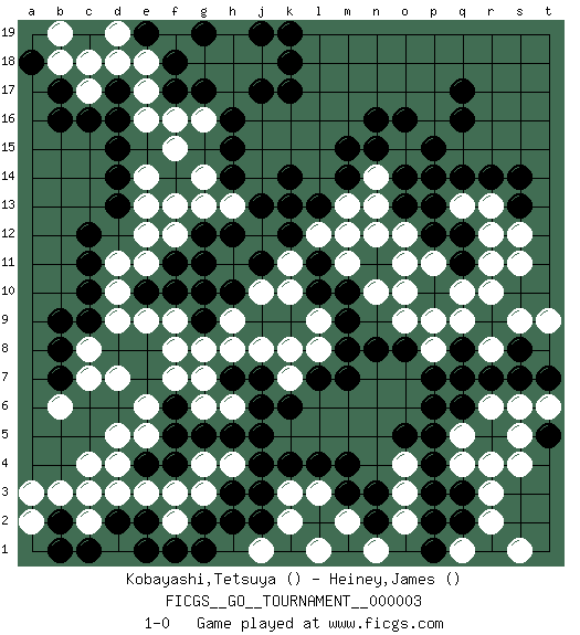 Last move : 1-0 2007 February 22 5:30:39 [Event "FICGS__GO__TOURNAMENT__000003"] [Site "FICGS"] [Date "2006.06.03"] [Round "1"] [Black "Kobayashi,Tetsuya"] [White "Heiney,James"] [Result "1-0"] 1.q16 c4 2.q3 q5 3.q8 o4 4.p5 q4 5.p4 r3 6.p3 r2 7.q6 r6 8.p6 e3 9.r7 s6 10.s7 s4 11.c16 e17 12.d14 c18 13.g17 f15 14.h15 f13 15.c12 d7 16.c9 c7 17.k4 h4 18.j6 f8 19.f11 h13 20.k14 h11 21.q17 q10 22.q12 o10 23.m10 o12 24.p14 s11 25.s13 n14 26.n16 l12 27.k12 k11 28.l11 m11 29.l10 k13 30.l13 m13 31.j13 m12 32.m15 j12 33.k13 k10 34.m8 k8 35.l7 n10 36.o13 n13 37.p12 p11 38.n11 p9 39.q11 r11 40.r9 r10 41.o8 q9 42.g12 f12 43.h12 g14 44.j11 j10 45.h10 h9 46.g11 e11 47.e10 d11 48.c11 d10 49.f10 d9 50.b8 c8 51.c10 e12 52.h3 g4 53.j3 g3 54.b7 b6 55.g9 h8 56.h7 g8 57.q2 r13 58.r14 q13 59.p13 r12 60.q14 s9 61.b17 g18 62.h18 h17 63.j17 j18 64.h16 h19 65.k18 h17 66.k17 o15 67.o16 l8 68.m7 j1 69.g2 f2 70.h2 k2 71.m3 k3 72.j4 l3 73.l4 m2 74.n3 o3 75.n2 o2 76.m4 n1 77.o5 l1 78.j2 q1 79.p1 s1 80.p2 k7 81.k6 l9 82.m9 p8 83.p7 r8 84.q7 b18 85.f6 h6 86.j7 j8 87.h5 g6 88.g5 g7 89.f4 f3 90.e4 d4 91.f18 h18 92.f17 g16 93.k19 f19 94.j19 e18 95.g19 f16 96.f1 d3 97.t5 t6 98.r5 r4 99.t7 s5 100.d16 e16 101.h14 g13 102.e19 d19 103.p15 f9 104.g10 e9 105.m14 n12 106.n15 o11 107.o14 e6 108.s8 t9 109.e1 c17 110.b16 e14 111.d13 e13 112.b2 d1 113.d2 c2 114.c1 c3 115.g1 b3 116.d17 d18 117.d15 d5 118.f5 f7 119.a18 b19 120.b9 s12 121.s14 a3 122.e2 a2 123.b1 e5 124.j5 o9 125.n8 1-0 This go game has been lost on time (started : 2006.06.03 13:0:3) Here are the names of the openings (joseki) played in the four corners : Corner q4 : q3 q5 Komoku (Somok, Xiao~mu`) 3-4 Point. The komoku (3-4) point is the traditional corner enclosure move.. Ikken Takagakari (Hankan Nop'dakeolch'im, Yi Gaogua`jiao~, 1-Space High Approach). The 5-4 approach move has become more popular in modern times, as modern Go emphasizes speed and influence. Corner d16 : c16 e17 Komoku (Somok, Xiao~mu`) 3-4 Point. The komoku (3-4) point is the traditional corner enclosure move.. Ikken Kakari (Hankan Keolch'im, Yi Gua`jiao~, 1-Space Low Pincer). The small knight move is the basic approach move to the 3-4 point stone. It has been continually used for over four centuries. There are limitless variations, with new moves constantly being discovered. White 2 opens the door to a treaure store of joseki. Player Black won this Go (weiqi, baduk) game. Follow this game move after move (download)There is death in the hane. (Anonymous) You can't play chess if you're groggy from pills. (Anatoly Karpov)