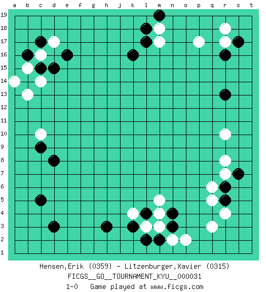 Last move : 1-0 2007 July 26 0:38:3 [Event "FICGS__GO__TOURNAMENT_KYU__000031 "] [Site "FICGS"] [Date "2007.05.02"] [Round "1"] [Black "Hensen,Erik "] [White "Litzenburger,Xavier "] [Result "1-0"] [Rating 1 "0359"] [Rating 2 "0315"] 1.r16 q3 2.c5 d17 3.r5 r7 4.c15 c16 5.d3 q5 6.d8 k4 7.e16 b15 8.b14 c14 9.h3 p17 10.r6 r4 11.d15 b13 12.b16 a14 13.c17 c10 14.k16 m17 15.l18 m18 16.l17 r17 17.s17 r18 18.r13 q6 19.c9 r10 20.s7 r8 21.k3 l3 22.l4 m4 23.l2 m3 24.m2 n2 25.n3 o2 26.n4 m5 27.m19 1-0 This go game has been lost on time (started : 2007.05.02 0:45:32) Here are the names of the openings (joseki) played in the four corners : Corner q4 : q3 r5Komoku (Somok, Xiao~mu`) 3-4 Point. The komoku (3-4) point is the traditional corner enclosure move..Ikken Kakari (Hankan Keolch'im, Yi Gua`jiao~, 1-Space Low Pincer). The small knight move is the basic approach move to the 3-4 point stone. It has been continually used for over four centuries. There are limitless variations, with new moves constantly being discovered. Black 2 opens the door to a treaure store of joseki. Corner d16 : d17 c15Komoku (Somok, Xiao~mu`) 3-4 Point. The komoku (3-4) point is the traditional corner enclosure move..Ikken Kakari (Hankan Keolch'im, Yi Gua`jiao~, 1-Space Low Pincer). The small knight move is the basic approach move to the 3-4 point stone. It has been continually used for over four centuries. There are limitless variations, with new moves constantly being discovered. Black 2 opens the door to a treaure store of joseki. Corner q16 : r16 p17Komoku (Somok, Xiao~mu`) 3-4 Point. The komoku (3-4) point is the traditional corner enclosure move..Ikken Kakari (Hankan Keolch'im, Yi Gua`jiao~, 1-Space Low Pincer). The small knight move is the basic approach move to the 3-4 point stone. It has been continually used for over four centuries. There are limitless variations, with new moves constantly being discovered. White 2 opens the door to a treaure store of joseki. Player Black won this Go (weiqi, baduk) game.Follow this game move after move (download ) In opponents' sphere of influence, avoid sharp conflict, don't move too deep. (Otake Hideo, 9p) Live, lose, and learn, by observing your opponent how to win. (Amber Steenbock)
