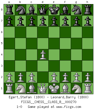 Last move : 1-0 2018 May 14 23:17:28 [Event "FICGS__CHESS__CLASS_B__000270"] [Site "FICGS"] [Date "2018.04.04"] [Round "1"] [White "Egert,Stefan"] [Black "Leonard,Barry"] [Result "1-0"] [WhiteElo "1800"] [BlackElo "1800"] 1.d4 1-0 This chess game has been lost on time (started : 2018.04.04 19:23:43) Queen's pawn Player White won this chess game. Follow this game move after move (download)When your house is on fire, you can't be bothered with the neighbors. Or, as we say in Chess, if your King is under attack you don't worry about losing a Pawn on the Queen's side. (Gary Kasparov) Viele Opfer benötigen überhaupt keine konkrete Berechnung. Es genügt sich die entstehende Position kurz vorzustellen, um uns davon zu überzeugen, dass das Opfer korrekt ist. (Mikhail Nekhemyevich Tal) Los finales de Peón son del Ajedrez lo que el cesped es del Golf. (Cecil Purdy) Toute estimation doit être constamment réévaluée. (Jacob Estrin) Yoga is 99% practice and 1% knowledge. (Sri Krishna Pattabhi Jois)