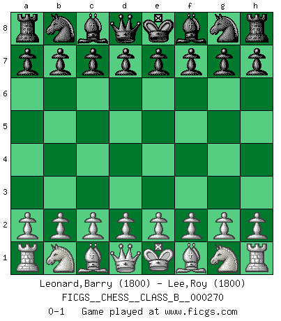 Last move : 0-1 2018 May 14 23:17:28 [Event "FICGS__CHESS__CLASS_B__000270"] [Site "FICGS"] [Date "2018.04.04"] [Round "1"] [White "Leonard,Barry"] [Black "Lee,Roy"] [Result "0-1"] [WhiteElo "1800"] [BlackElo "1800"] 0-1 This chess game has been lost on time (started : 2018.04.04 19:23:43) Player Black won this chess game. Follow this game move after move (download)Man is a frivolous, a specious creature, and like a Chess player, cares more for the process of attaining his goal than for the goal itself. (Dostoyevsky) Der Umstand, daß uns eine 7 Stunden Zeitkontrolle ermöglicht eine großartige, tiefe Partie zu spielen, ist für die Massenmedien nicht weiter von Bedeutung. (Alexej Shirov) Hay jugadores fuertes y personas amables y yo soy un jugador fuerte. (Bobby Fischer) Le joueur d'Echecs qui veut atteindre le top est obligé de développer son propre credo créatif. Alexeï Stepanovicth Souétine. Il est facile d'écrire des livres ! Ce qui est difficile, c'est de jouer ! (Alexeï Stepanovicth Souétine) Whatever you do, don't be bored. This is absolutely the most exciting time we could have possibly hoped to be alive. And things are just starting. (From movie Waking life)
